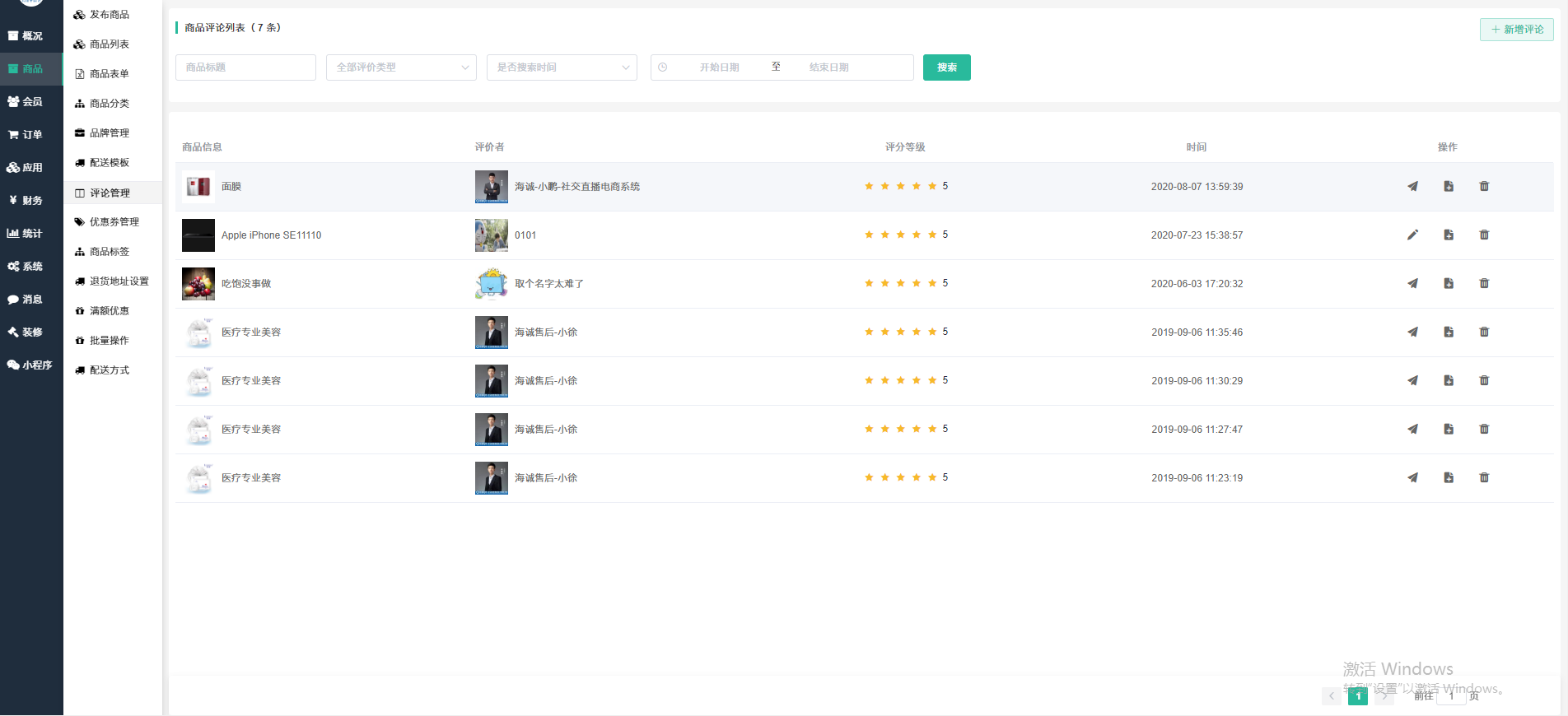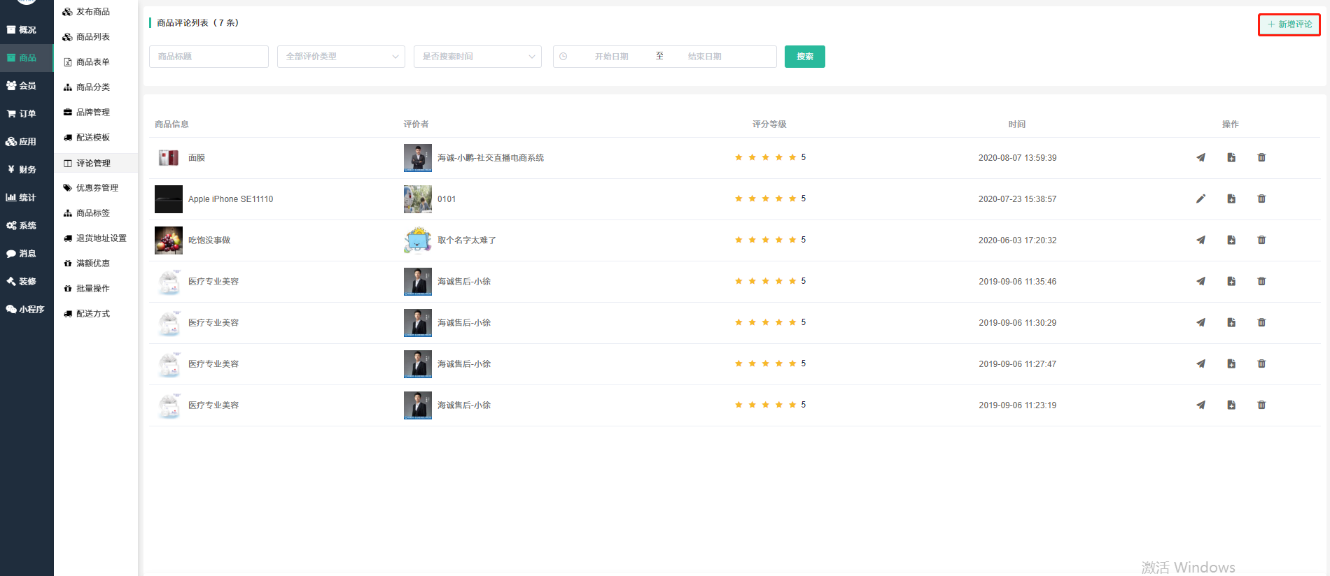 ## 1、评价管理,所有的商品评价都会在这里展示。