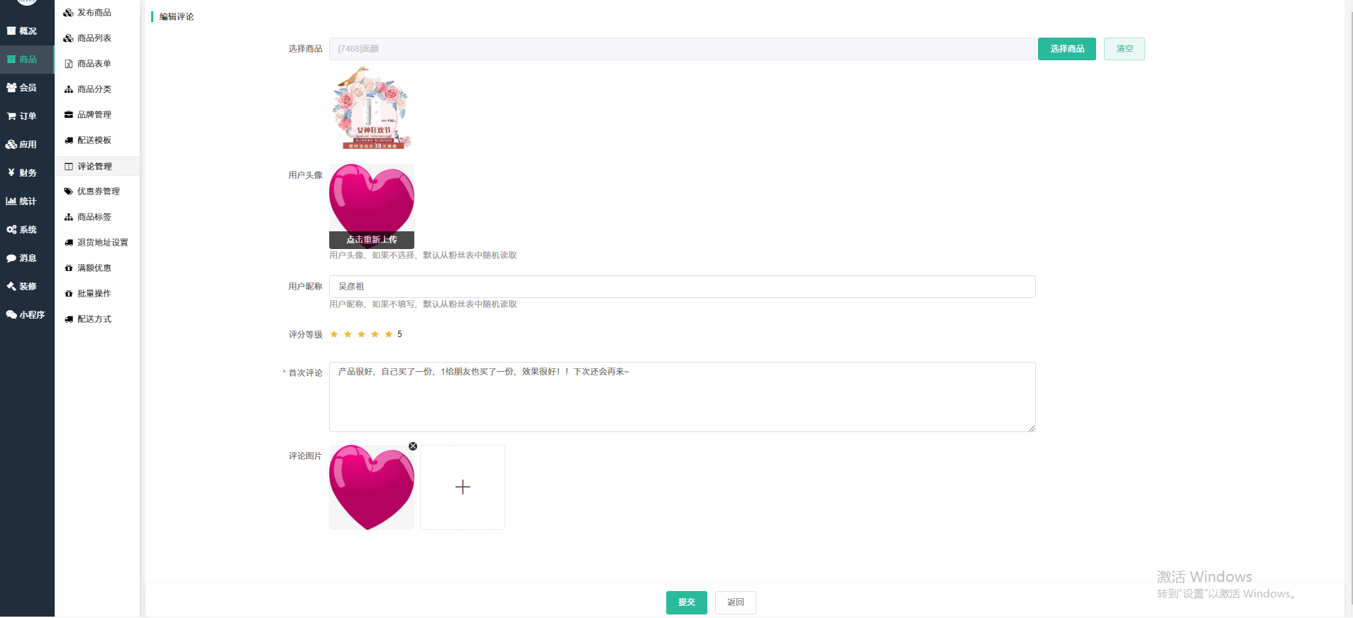 ## 2、后台添加评价,选择自己要评价的商品,填写上评价内容和虚拟用户头像和名称即可