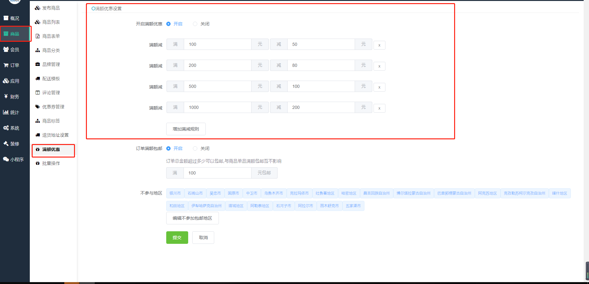 ## 1、进入满额优惠板块,添加满额优惠条件保存即可。这里针对商城所有的商品。