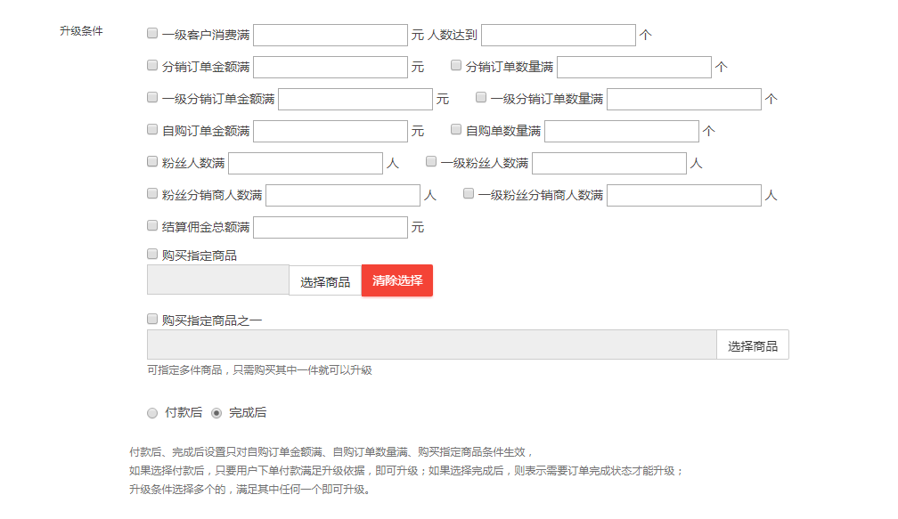 ## 【注意:只有分销商订单总额(完成的订单)和分销商订单总数(完成的订单)以及自购订单金额和订单数量受到是否开启分销自购的限制,其他升级依据都不受限制。】