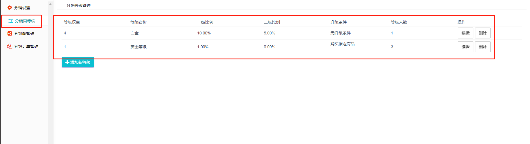 ## 商家可以对分销商等级信息进行管理,支持编辑等级名称、等级权重(级别越高权重越大)、分销商等级比例、升级条件(不填写则不自动升级)、和删除功能。