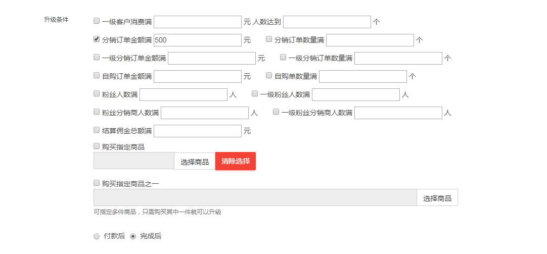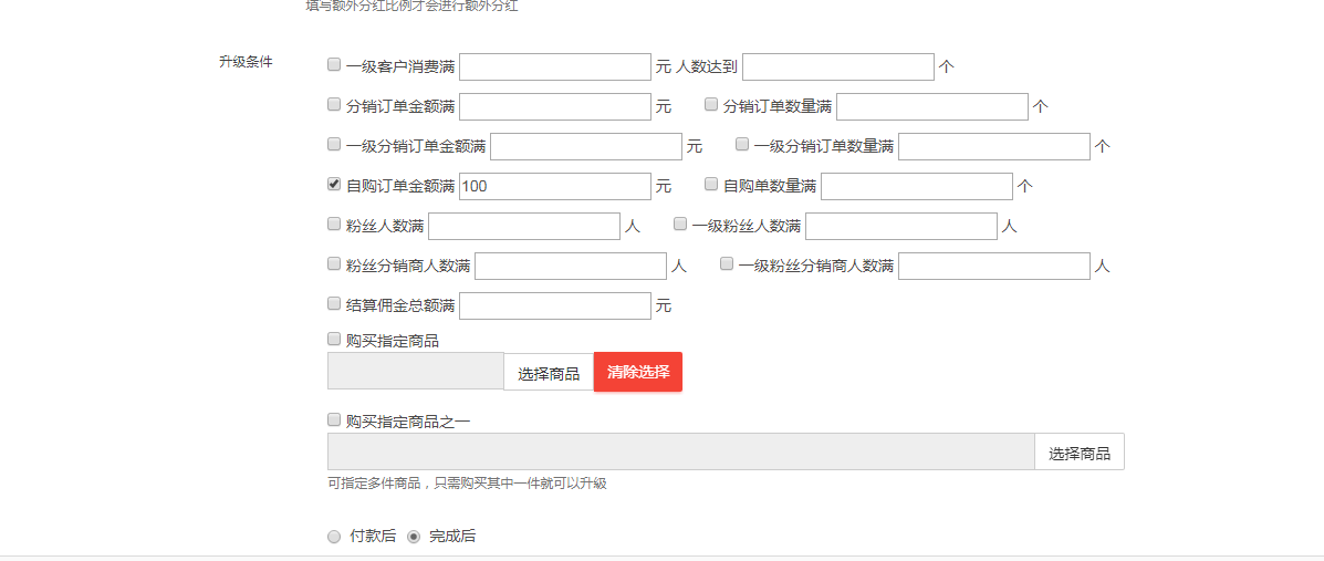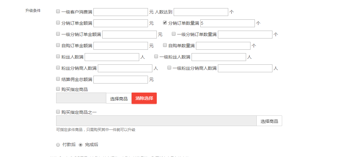 ## (11)只选择购买指定商品为升级条件,设置购买指定商品,订单完成后自动升级,分销商收到升级通知。