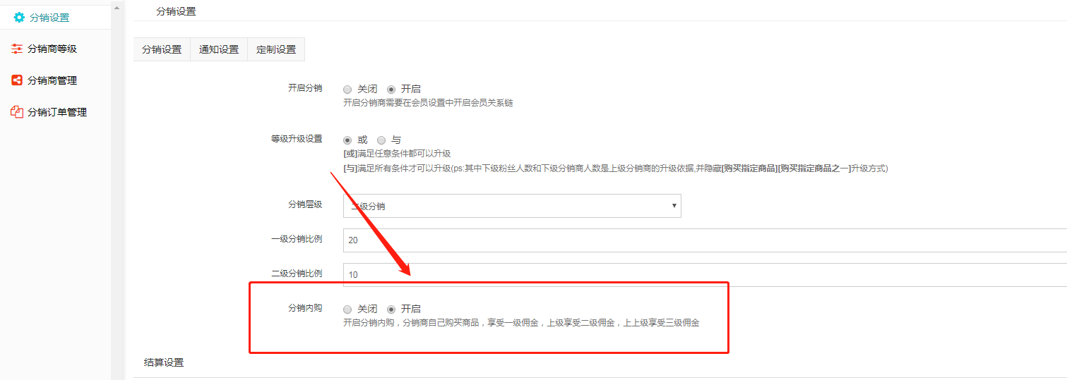 ## 【注:如上述设置“分销订单金额满多少”为升级条件一样,区别在于开启内购的话即为分销商自己+下级分销的订单总额,即分销商购买商城的商品金额为100元,下级分销商购买商城的商品为100元,则分销就会自动升级到相应的分销等级,就会享受相应等级下的佣金比例。】