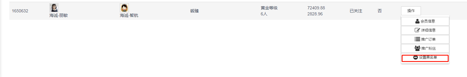 ## ⑸ 点击操作—黑名单设置:将分销商设置成为黑名单,则无法访问商城,更不能发展下线。