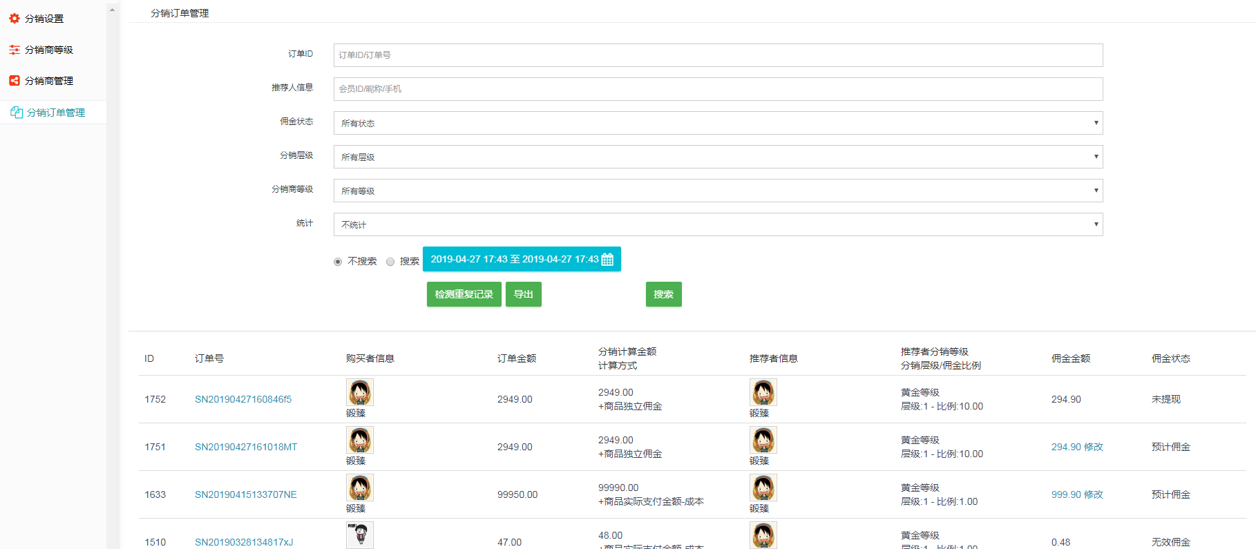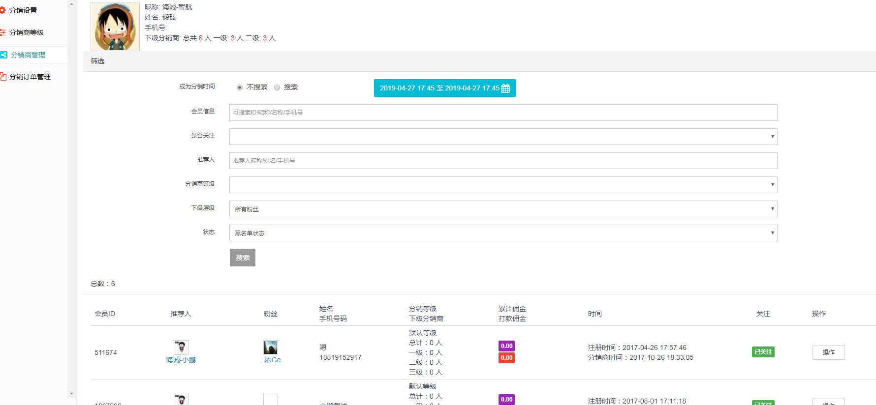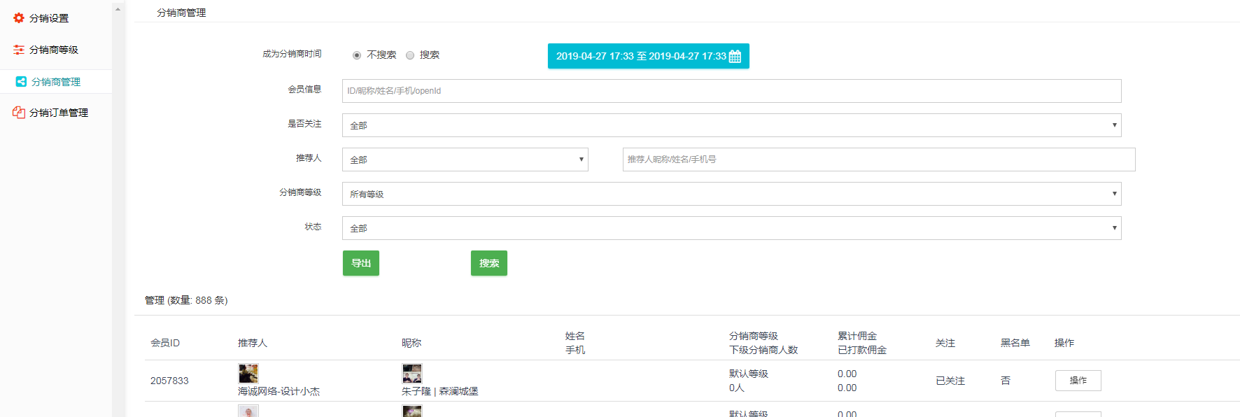 ## 三、分销商管理支持通过会员信息ID/昵称/手机/姓名信息、关注情况、推荐人昵称/姓名/手机号、分销商等级、黑名单状态、成为分销商时间等筛选条件来搜索分销商,方便商家管理。