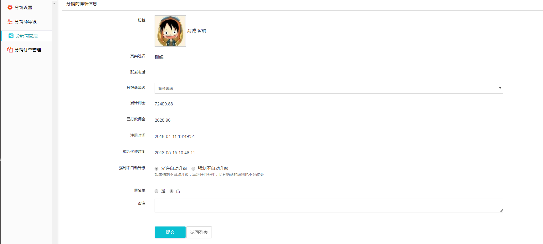 ## 二、会员成为分销商后,商家可在后台—分销商管理查看并对此进行管理