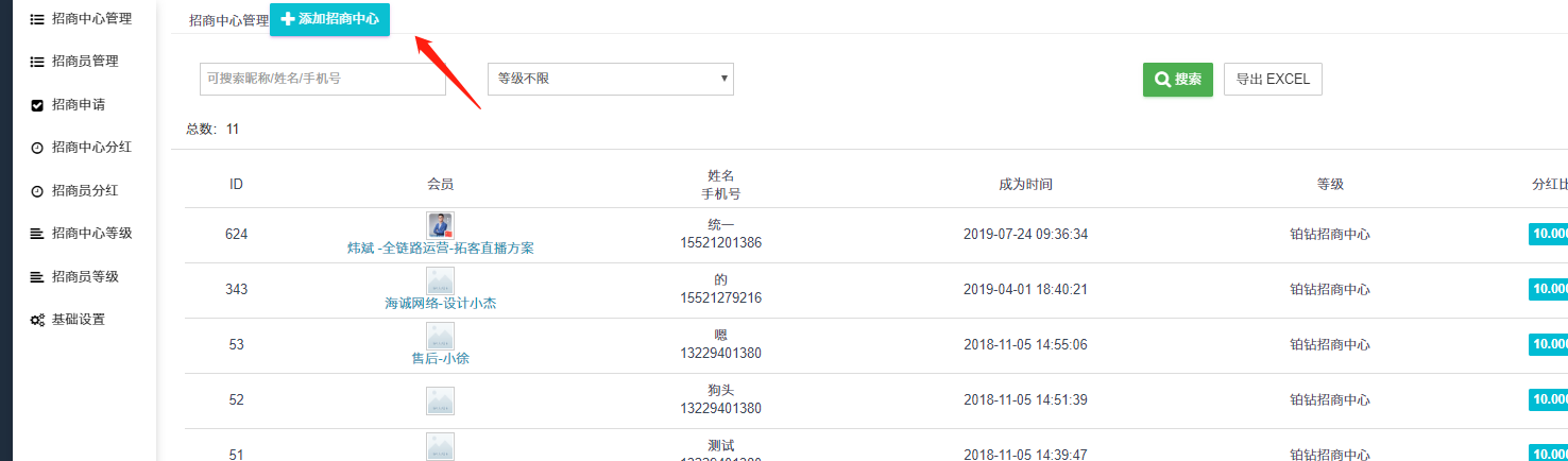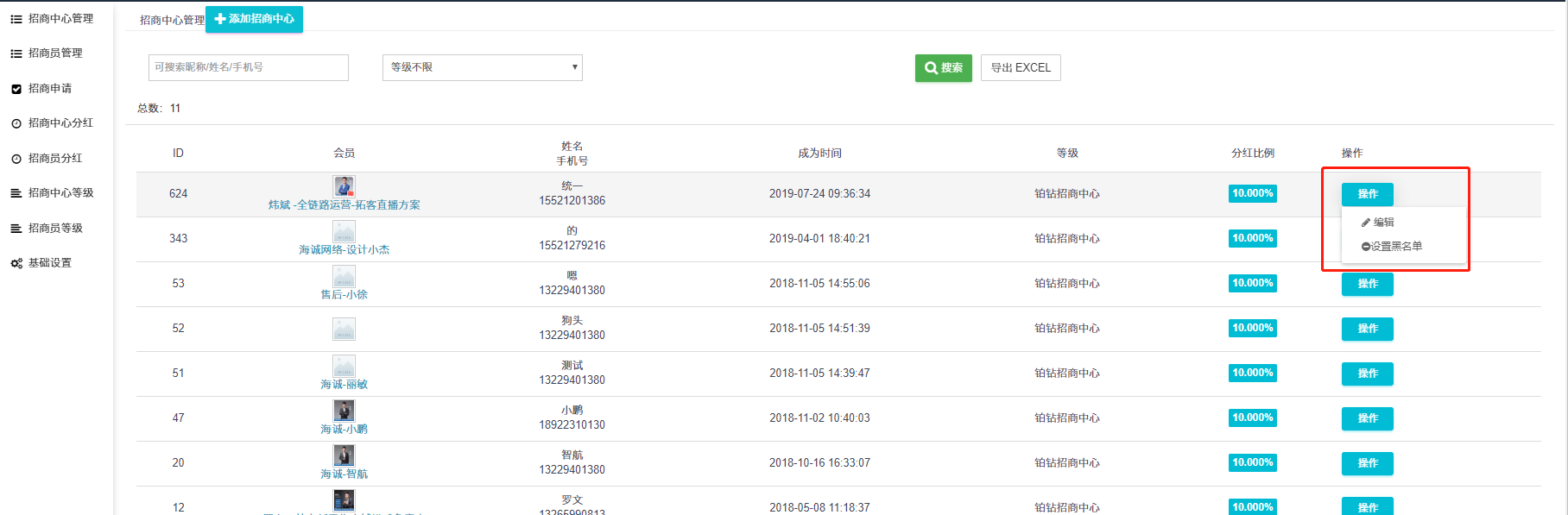 ## ②编辑招商中心信息(招商中心真实姓名、手机和等级)。