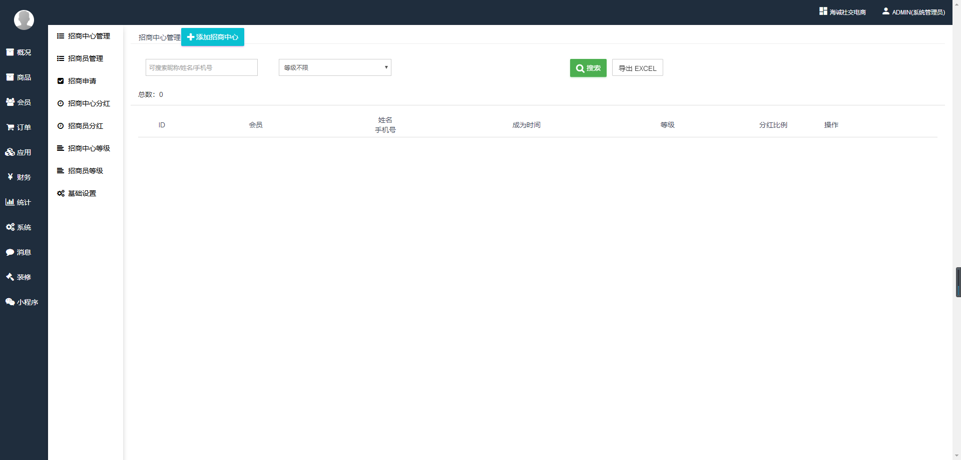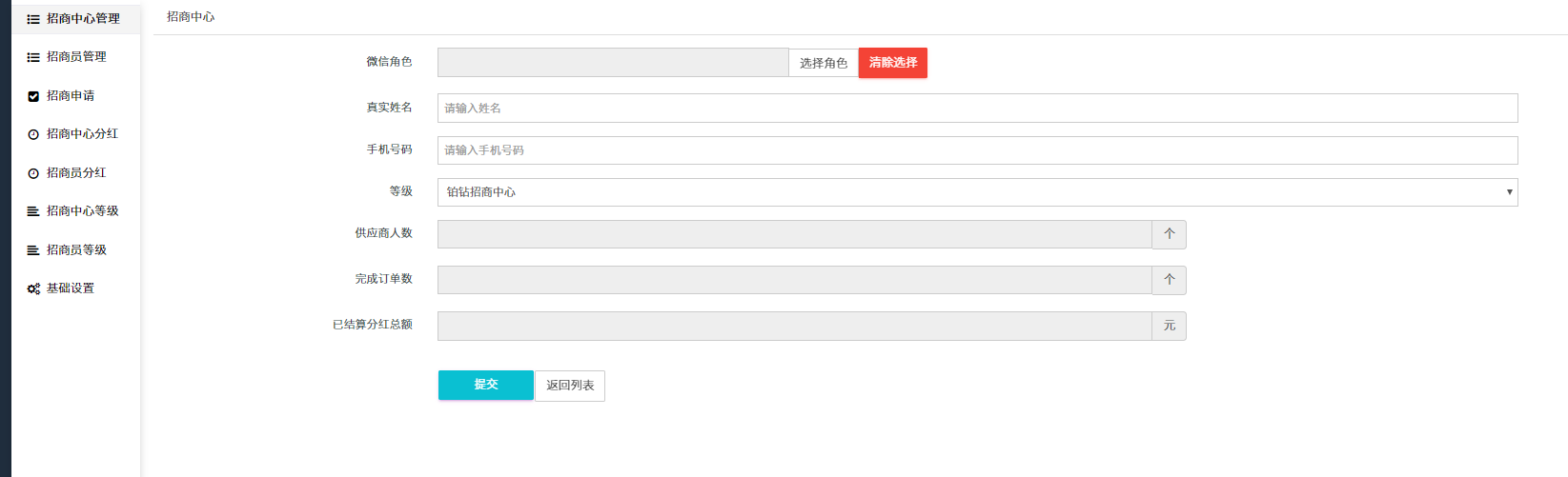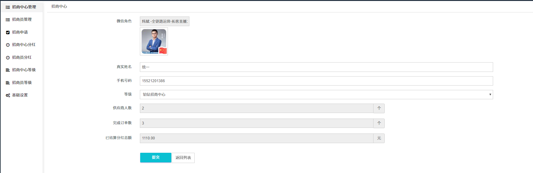 ## 3、添加招商中心(填写招商中心微信、真实姓名、手机和等级)。