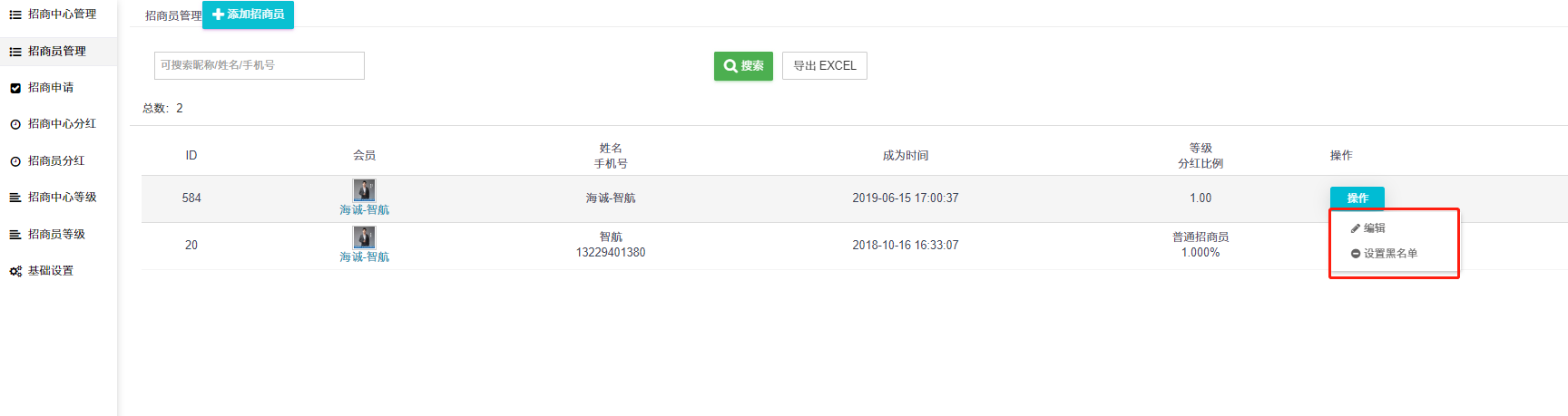 ## ②编辑招商员信息(招商员真实姓名、手机和等级)。