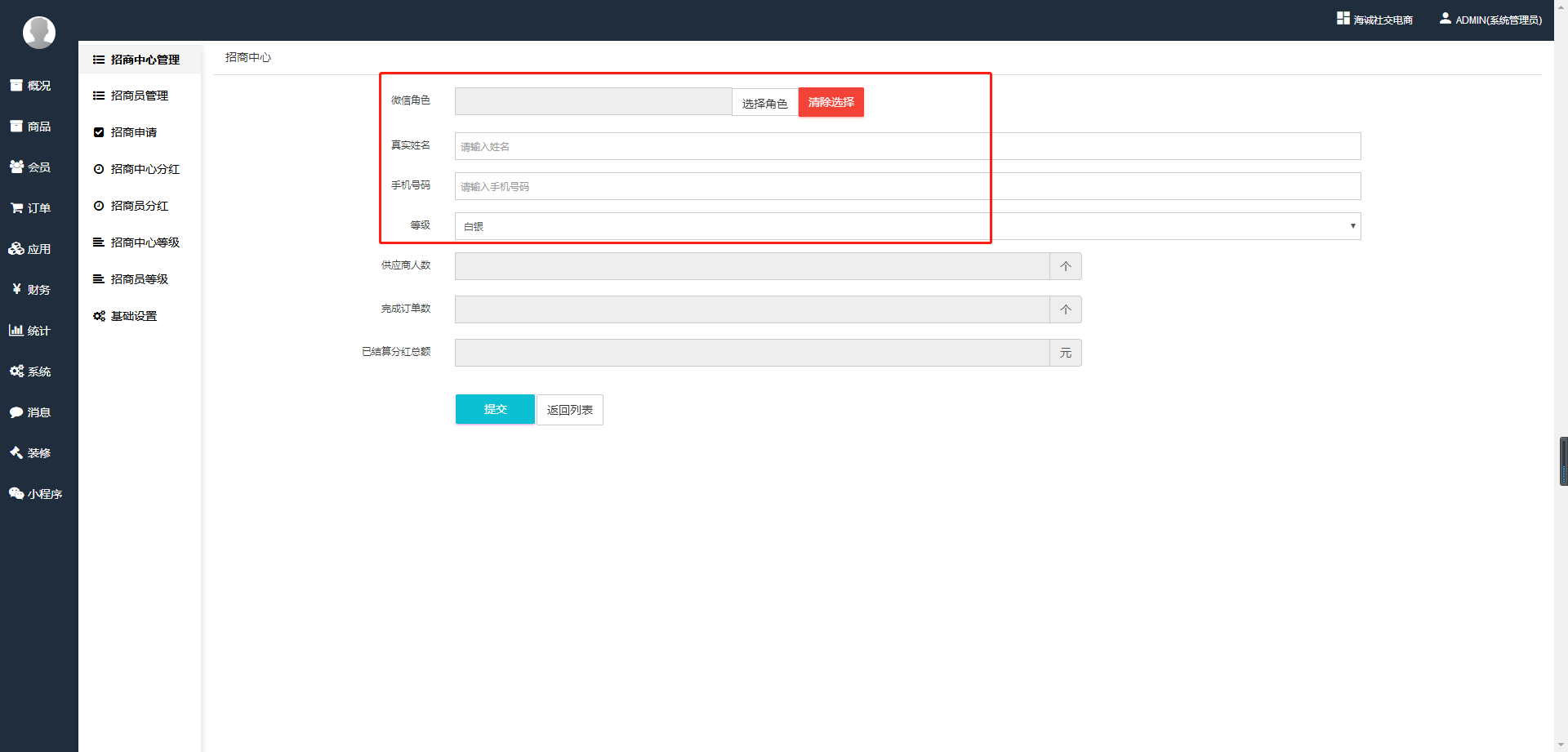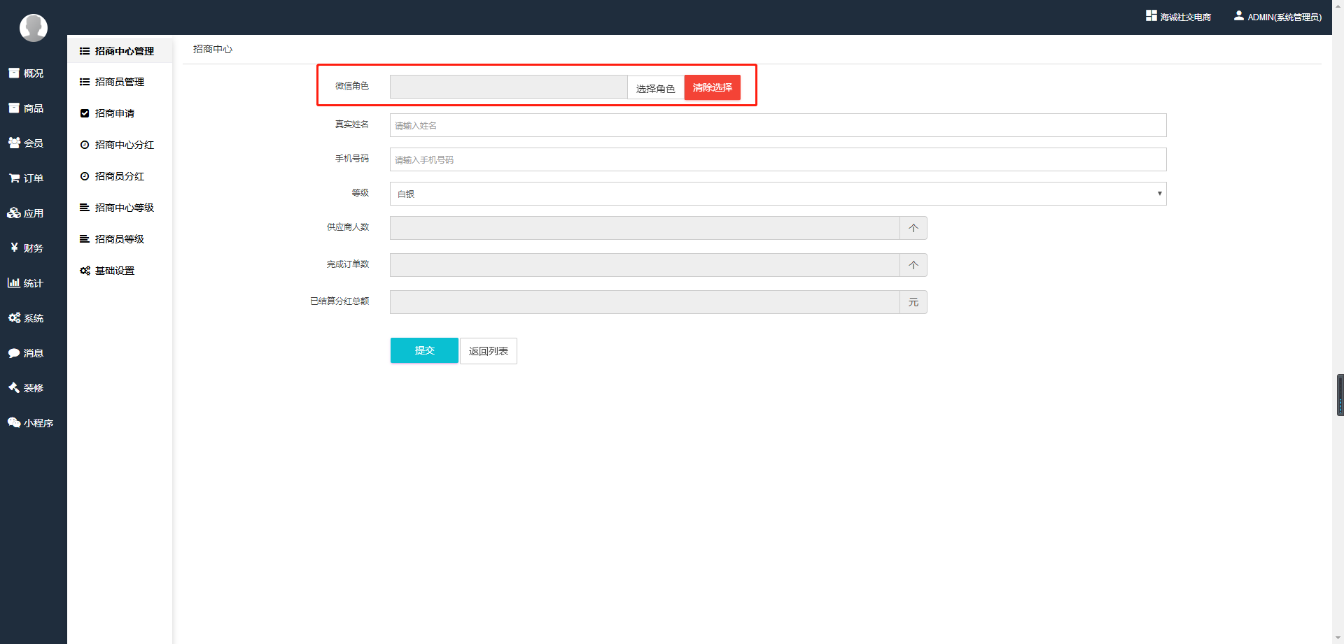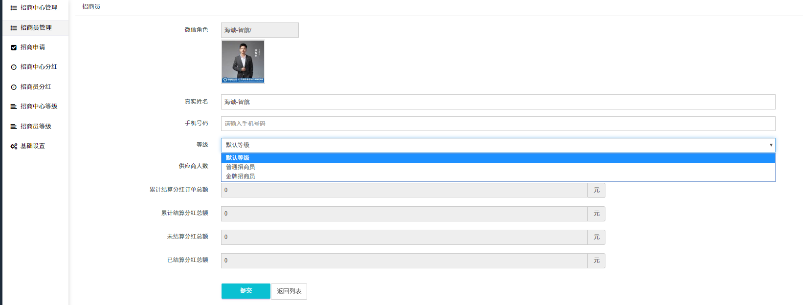 ## 3、添加招商员(填写招商员微信、真实姓名、手机和等级)。