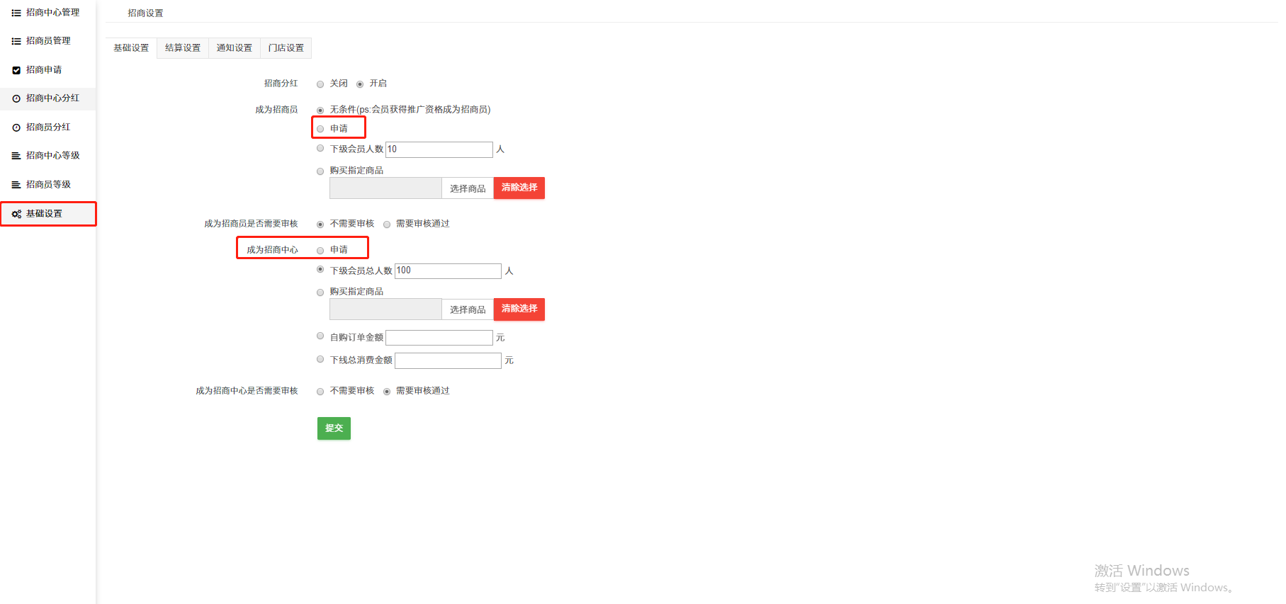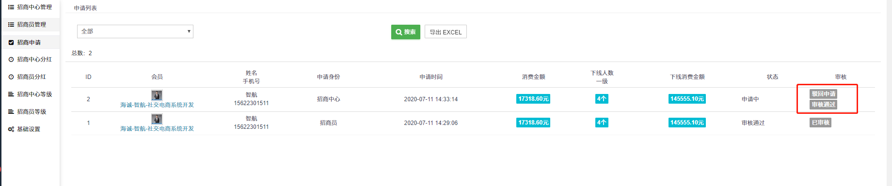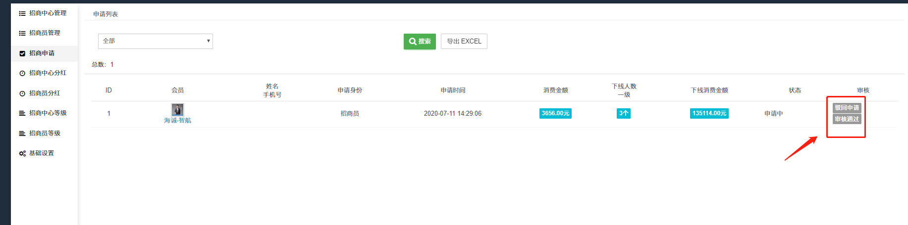 ## 如果后台选择成为招商员/招商中心条件为申请,并且申请是需要审核通过的,后台就可以查看并操作审核是否通过。