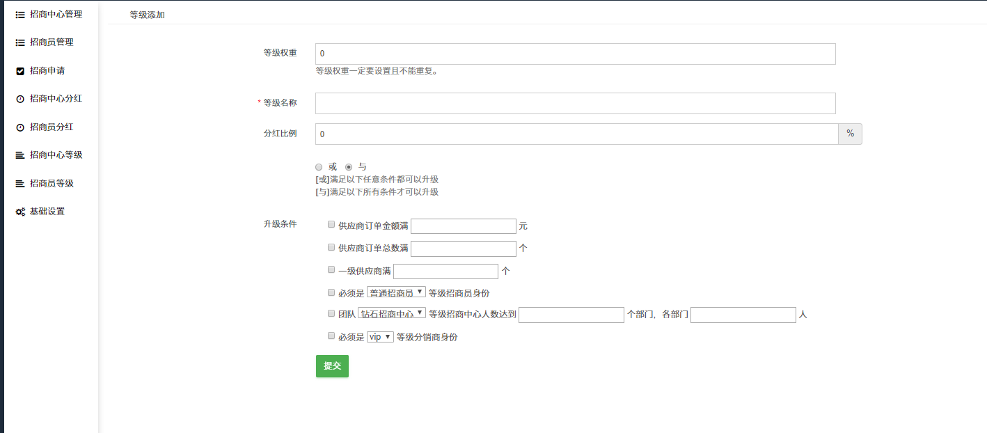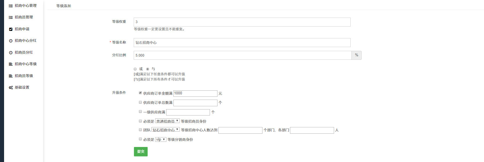 ## ⑥必须是XX等级分销商身份:会员达到XX分销商等级之后自动升级为该招商中心等级