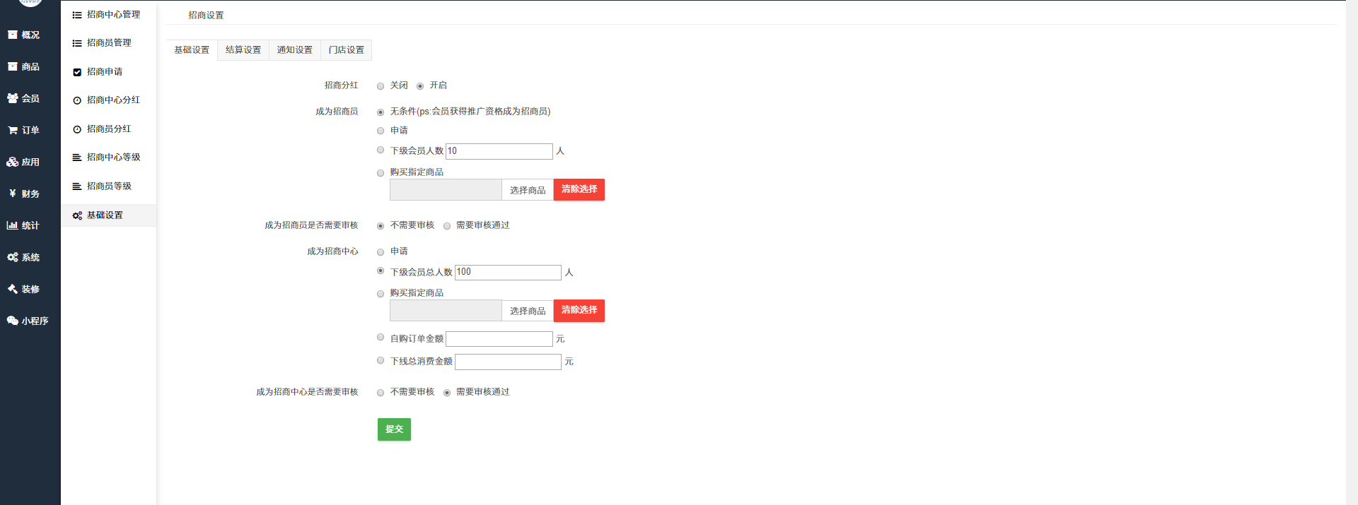 ## ⑤成为招商中心是否需要审核(不需要审核/需要审核通过):成为招商中心的条件如果选择是申请,那么这里可以开启是否需要审核该会员的申请,他才能成为平台招商中心