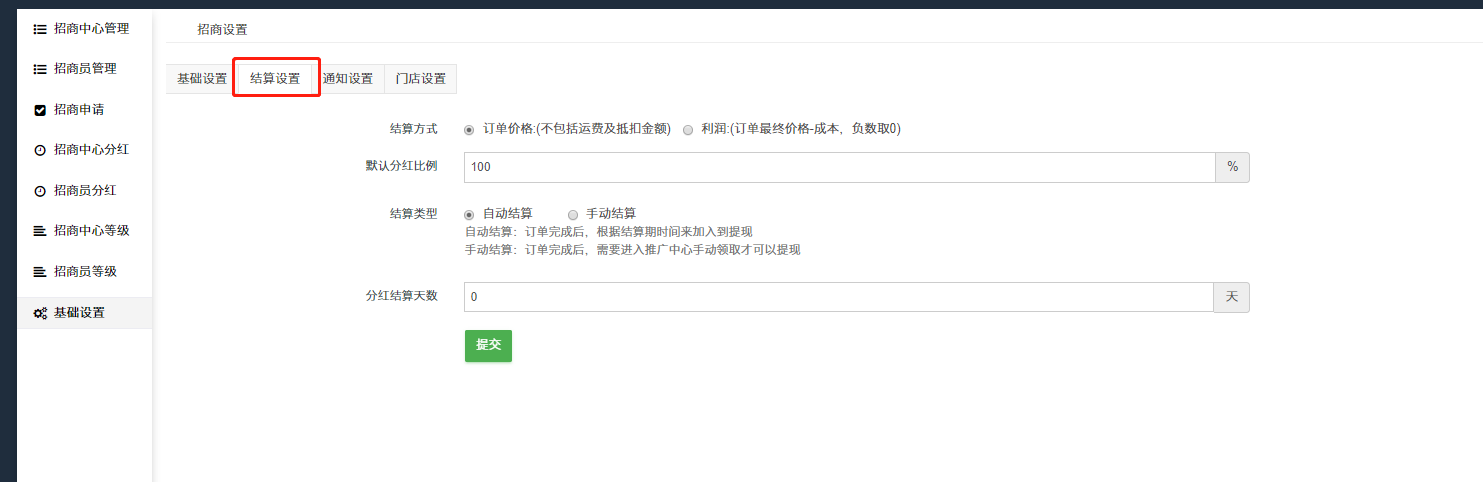 ## ④分红结算天数:分红结算的天数,0天为订单完成后立刻结算