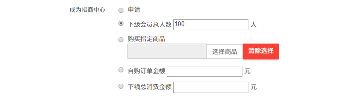 ## ③成为招商员是否需要审核(不需要审核/需要审核通过):成为招商员的条件如果选择是申请,那么这里可以开启是否需要审核该会员的申请,他才能成为平台招商员