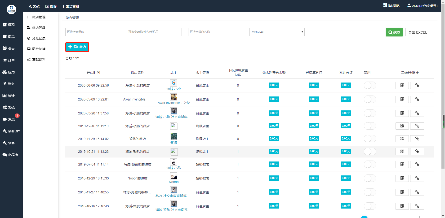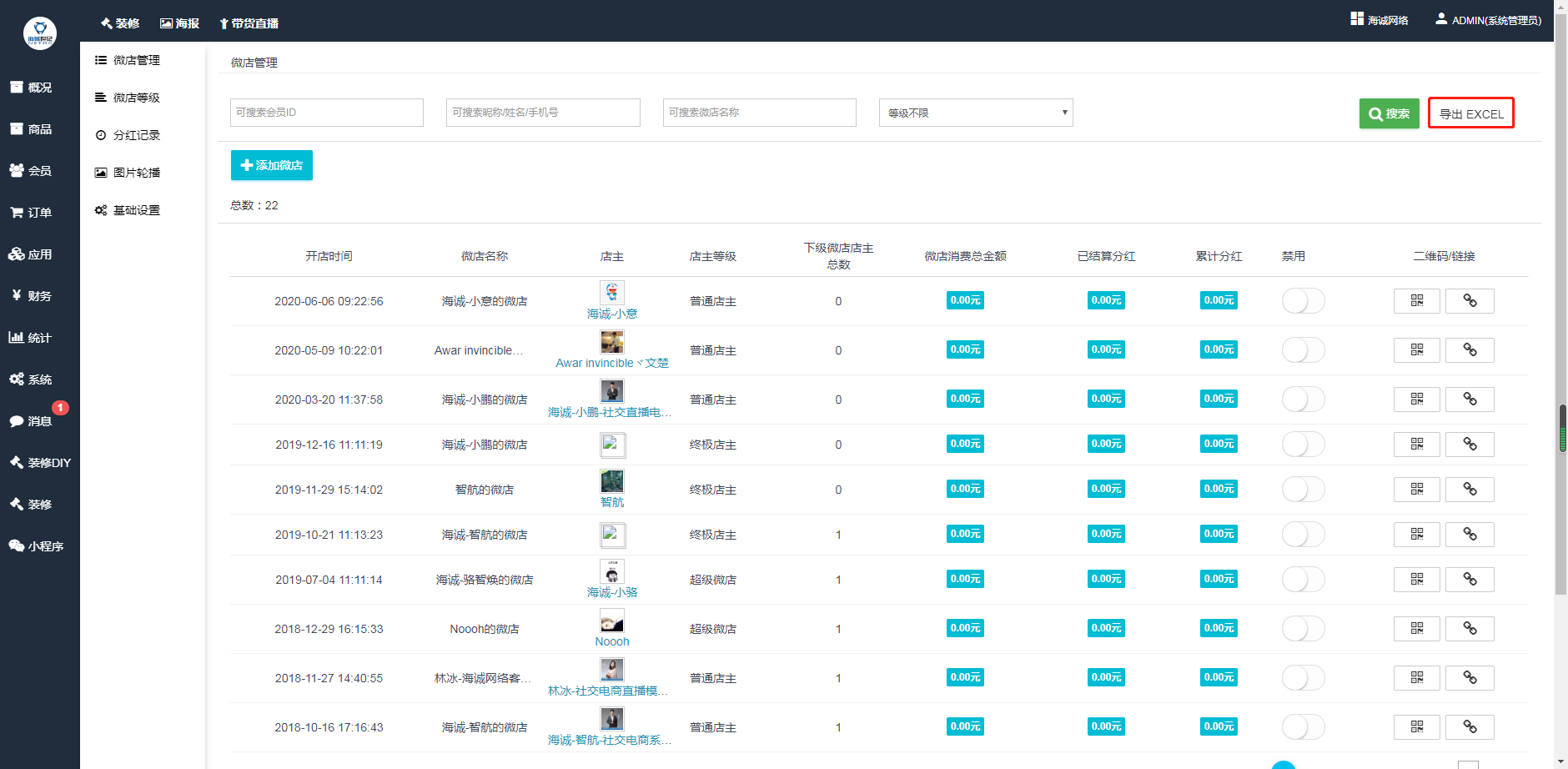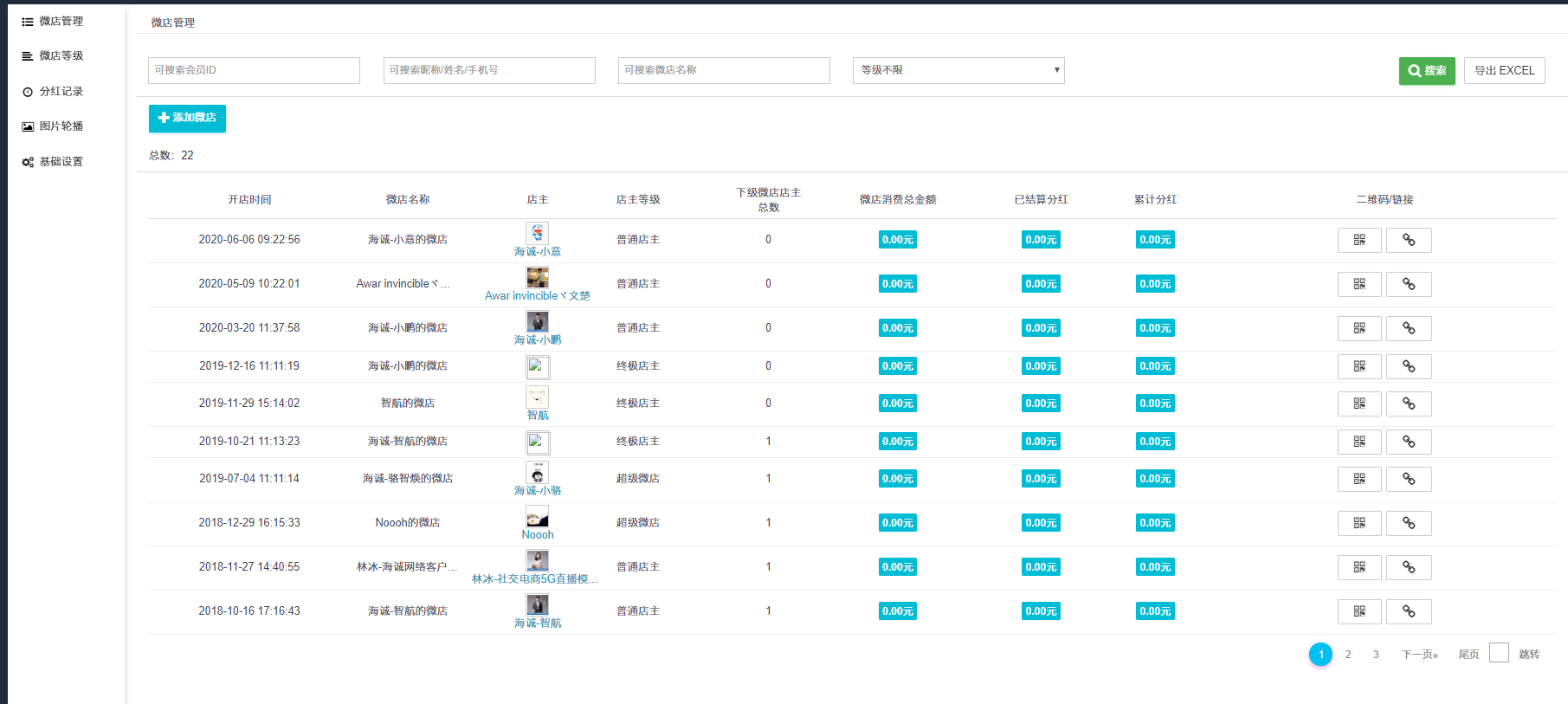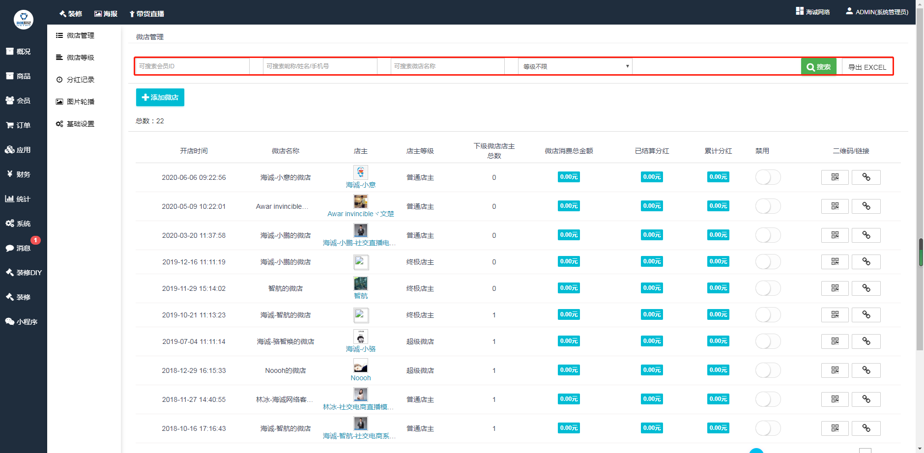 ## 1、可按会员ID、昵称、姓名、手机号、微店名称、微店等级进行搜索筛选微店