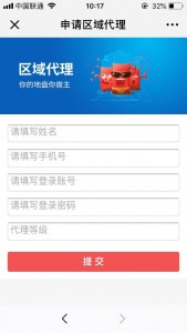 ## (2)例如商城后台设置申请。会员可以在**前端会员中心—我的推广—区域代理**进行填写信息提交核审。 如下图片