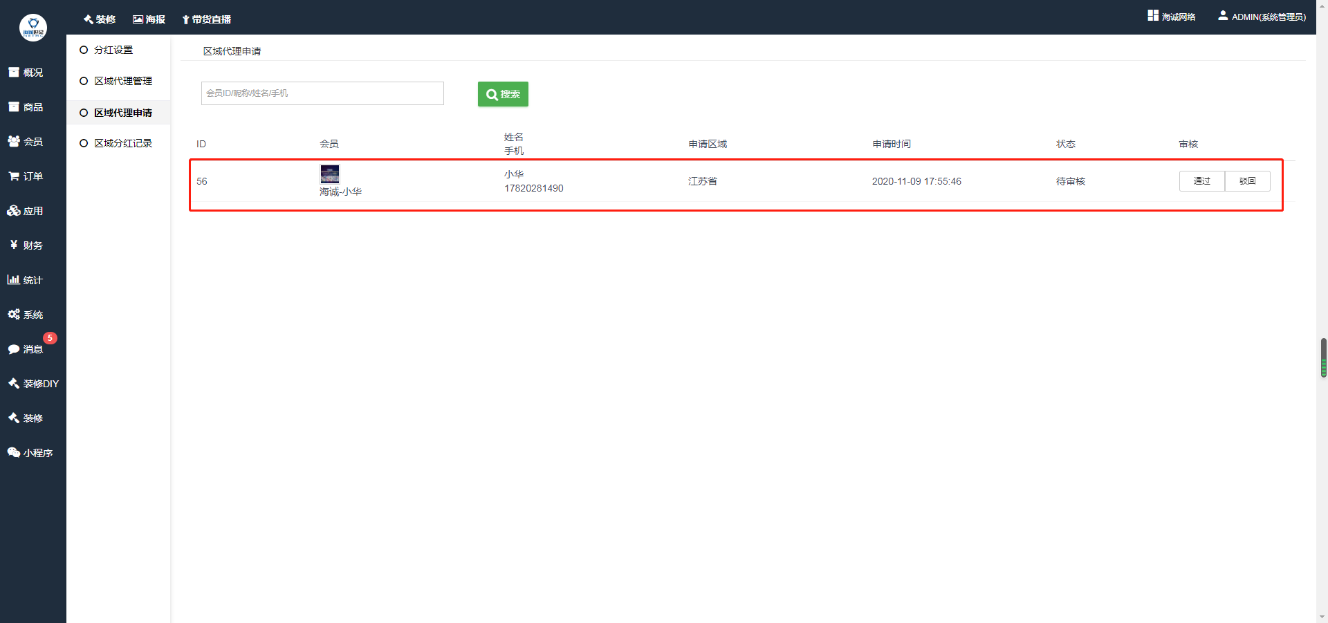 ## 3、是否需要审核,如果选择的是不需要,那么会员填写申请信息点击提交后,即成为区域代理。 如果选择的是需要,那么会员填写申请信息点击提交后,需要商家商城后台区域代理申请手动点击通过,会员即成为区域代理。 如果下图: