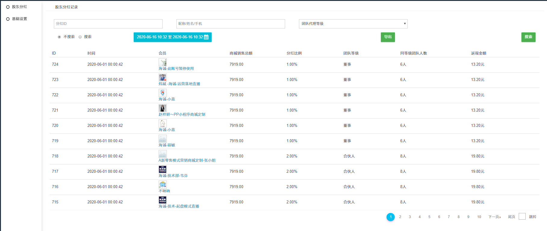 ## 1)搜索导出功能;搜索分红ID、时间、会员、商城销售总额、分红比例、团队等级、同等级团队人数、返现金额