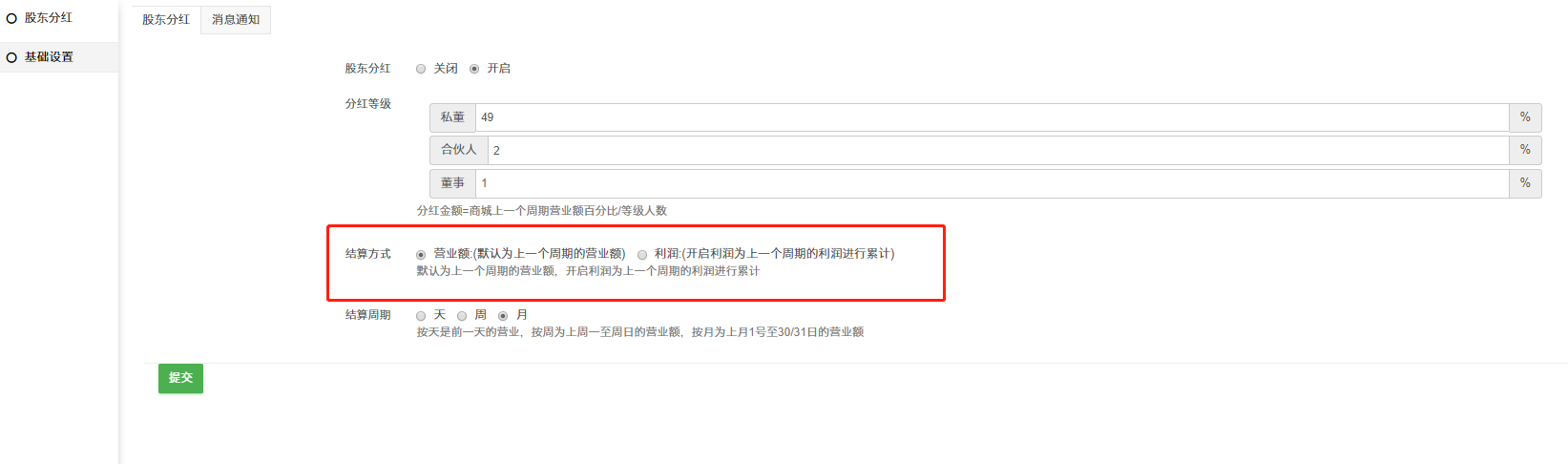 分红结算方式包括营业额(默认为上一个周期的营业额) 、利润(上一个周期的利润进行累计)两种,只能选择一种。