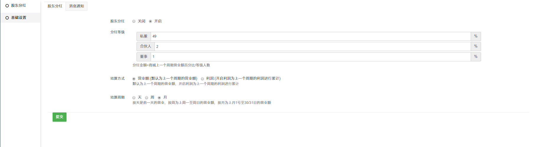 股东分红依赖于经销商等级,(股东分红是基于经销商上的)设置指定经销商等级对应的股东分红比例,商城每天/周/月拿出前一周期营业额/利润的百分比平均分配给该等级经销商