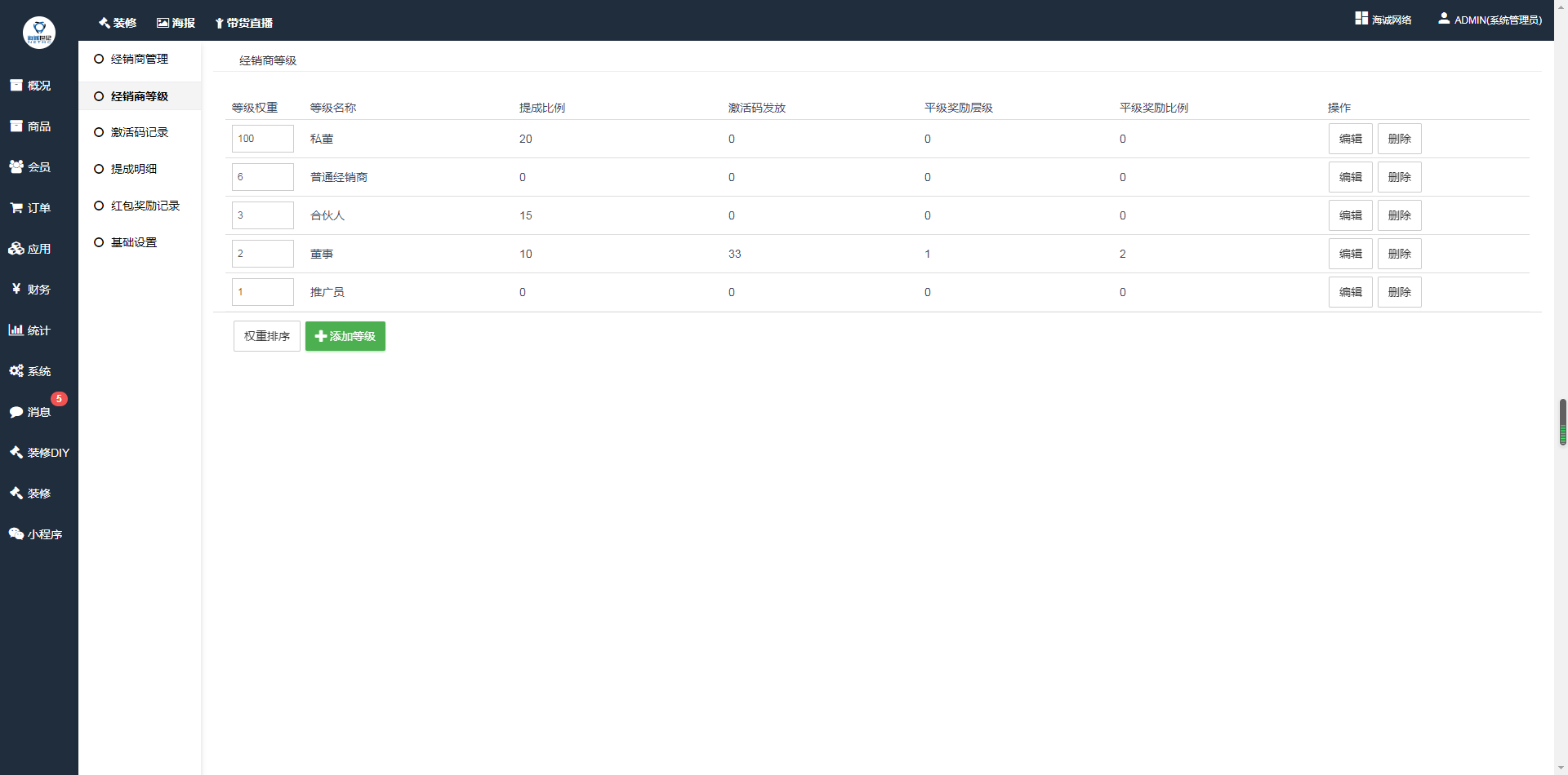 ## 支持添加、删除、编辑经销商等级信息,经销商等级名称可根据商城需要设置,可设置多个等级