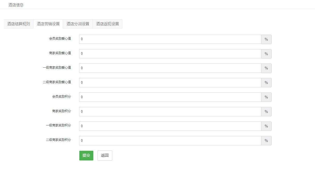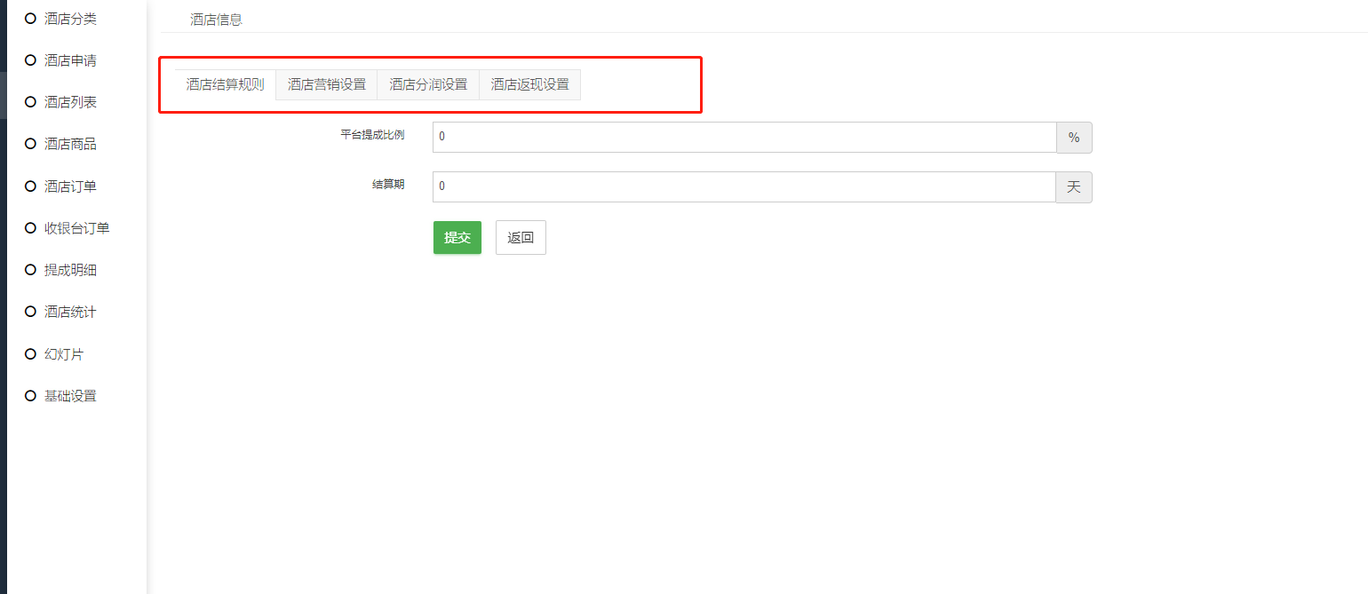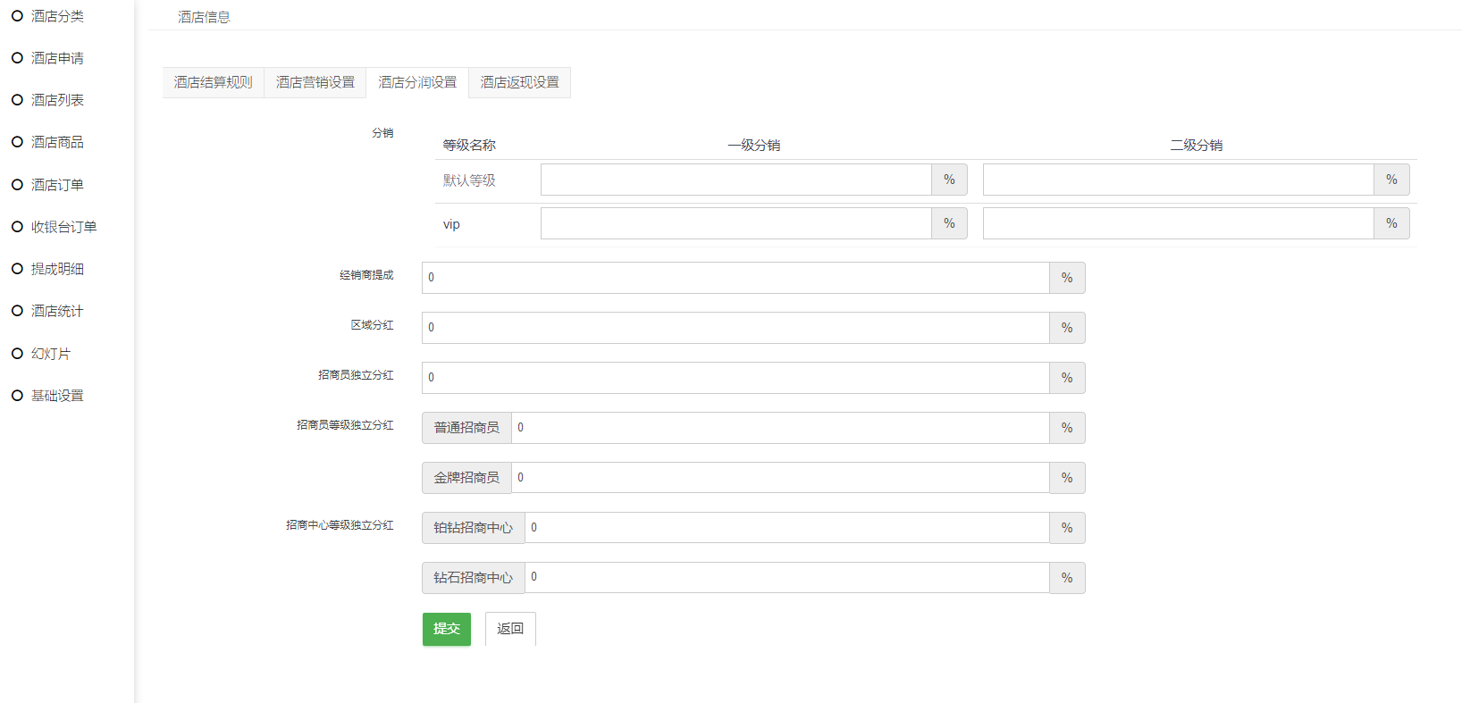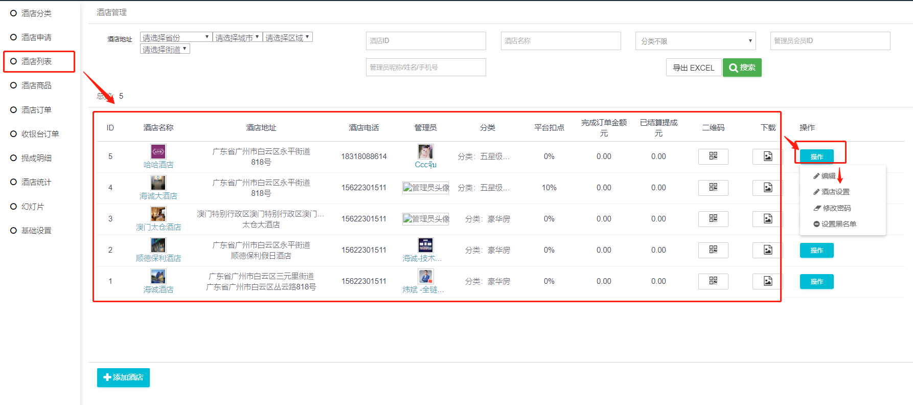 ## 酒店列表主要可以查看所有的酒店管理,可编辑设置每个,酒店的分润规则及账号密码管理。