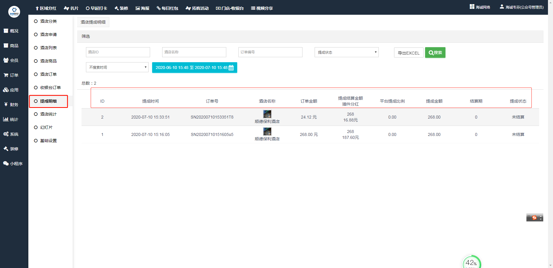 ## 记录每一笔提成的提成时间、订单号、酒店名称、订单金额、结算金额、平台提成、提成金额、结算期、状态等信息。