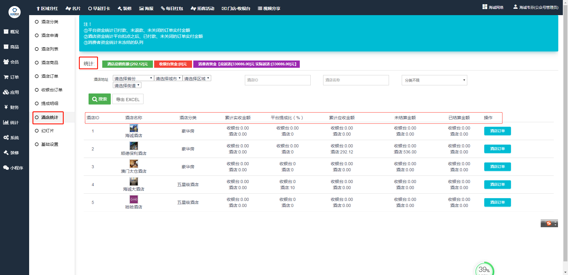 ## 统计每一个酒店的累计实收款金额、平台提成比例、累计应收款金额、未结算金额、已结算金额等。