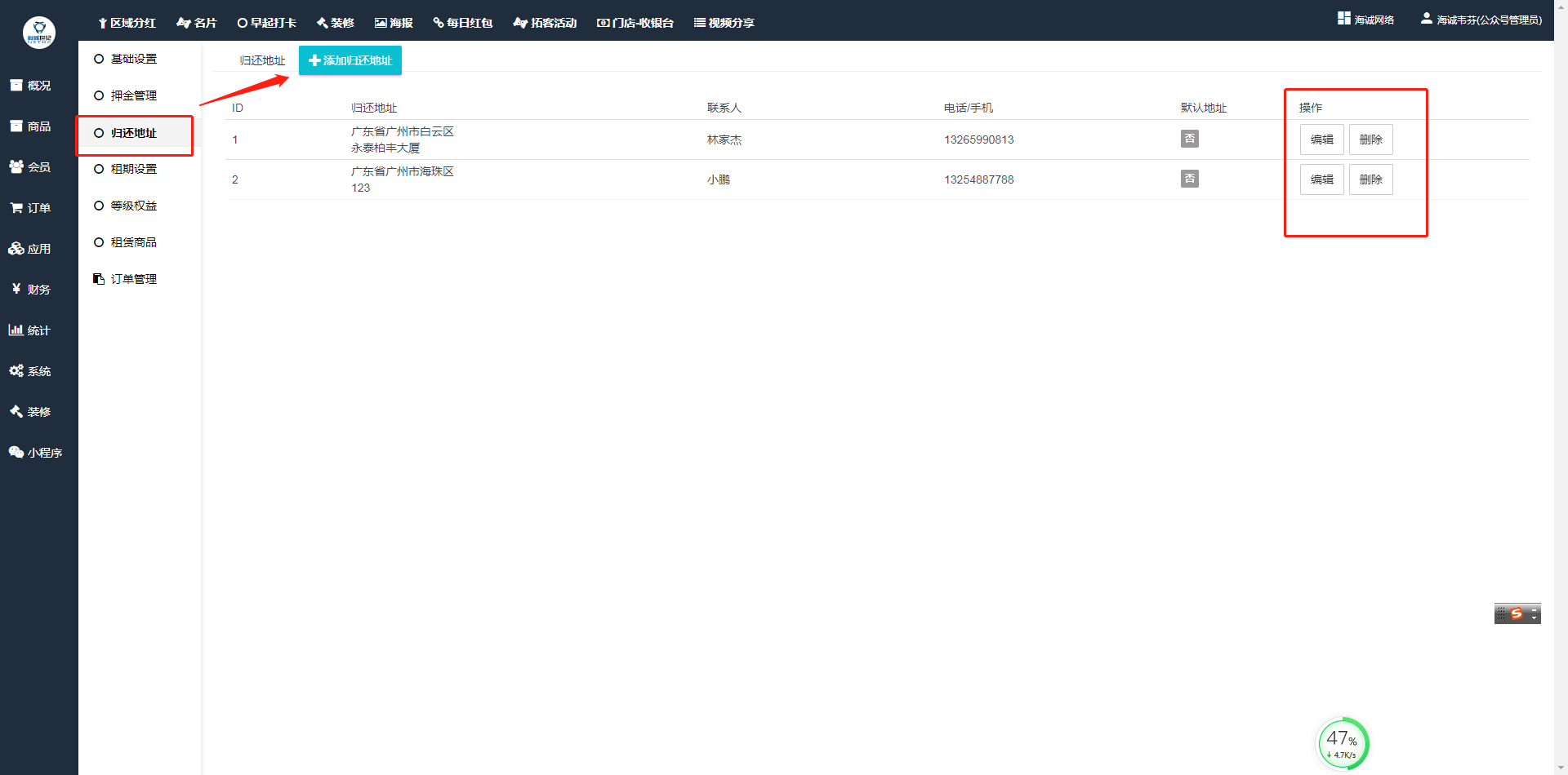 ## 支持添加多个归还地址:联系人、手机、邮编、归还地址、是否默认地址,用户归还租赁商品时可以选择归还到添加的任意地址。