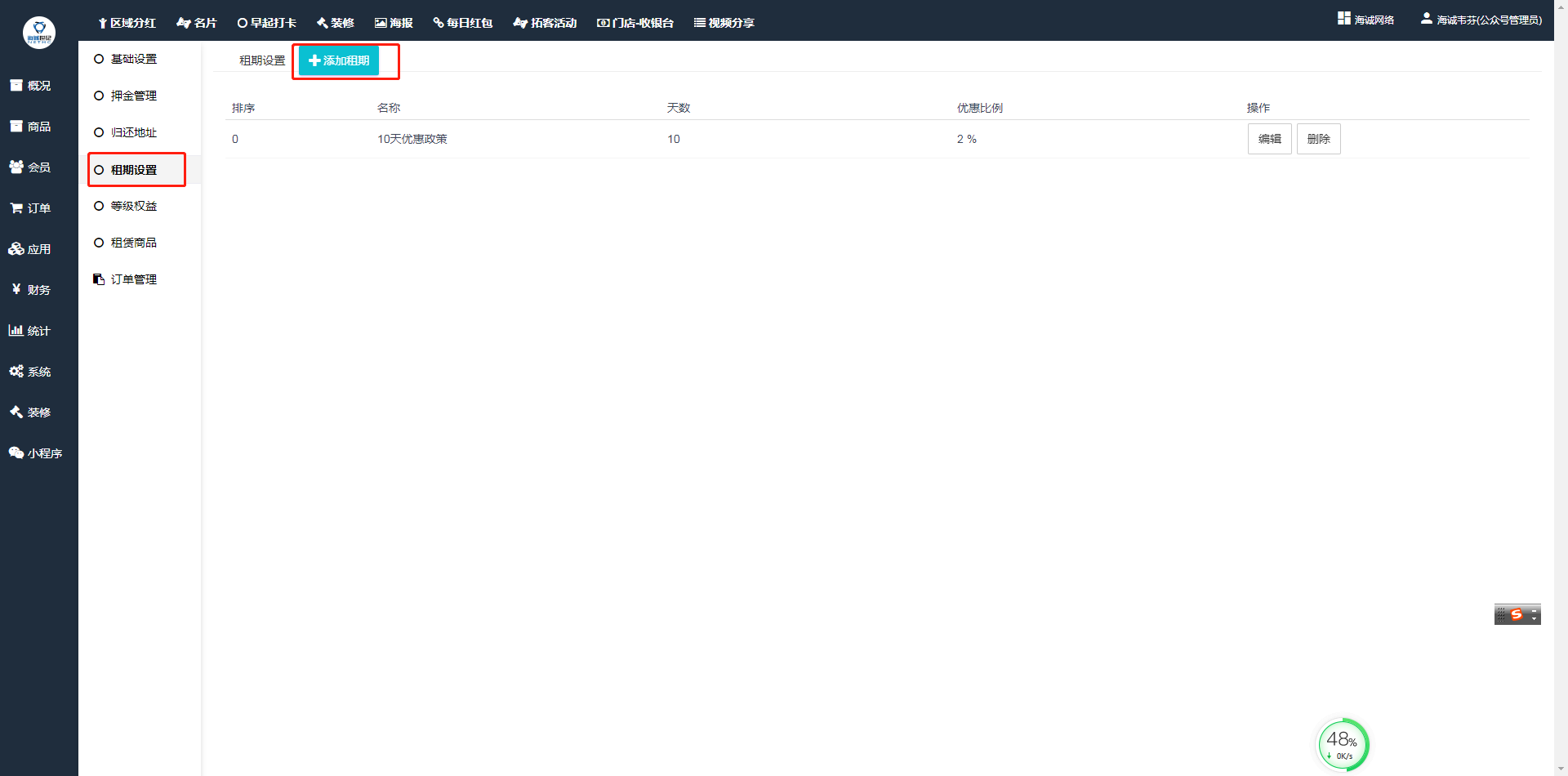 ## 添加租期后,用户租赁下单是可以快速选择租期,并且享受对应租期的优惠;用户也可以自定义设置租期,自定义设置的租期优惠按照小于设置的租期最接近的一个优惠执行