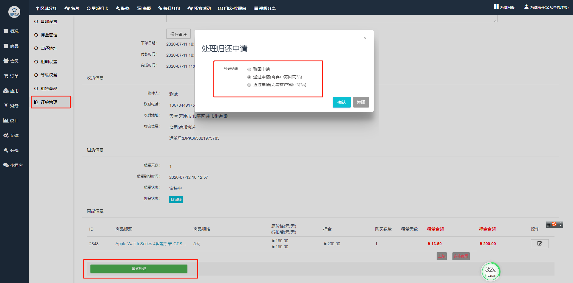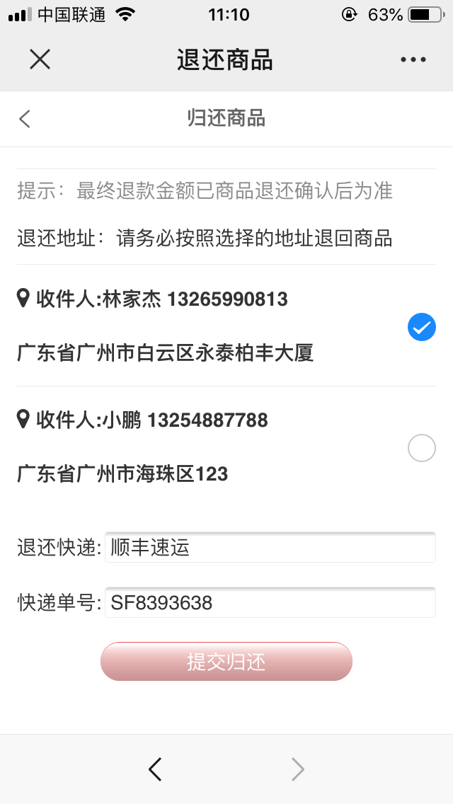## 客户在前端会员中心—租赁订单中申请退还,填完归还地址、物流信息后提交申请即可,等后台管理员审核,前端操作截图: