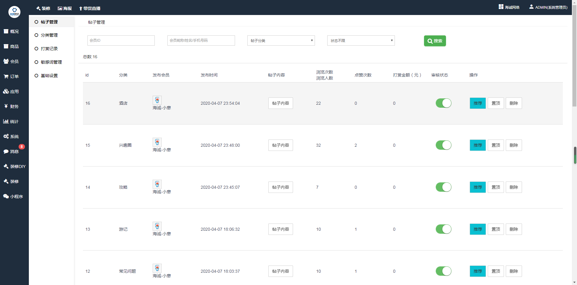 ## 在帖子管理中可以查看所有的帖子的信息,例如帖子内容、浏览次数(人数)、打赏金额等相关操作,支持帖子置顶、推荐、删除等操作