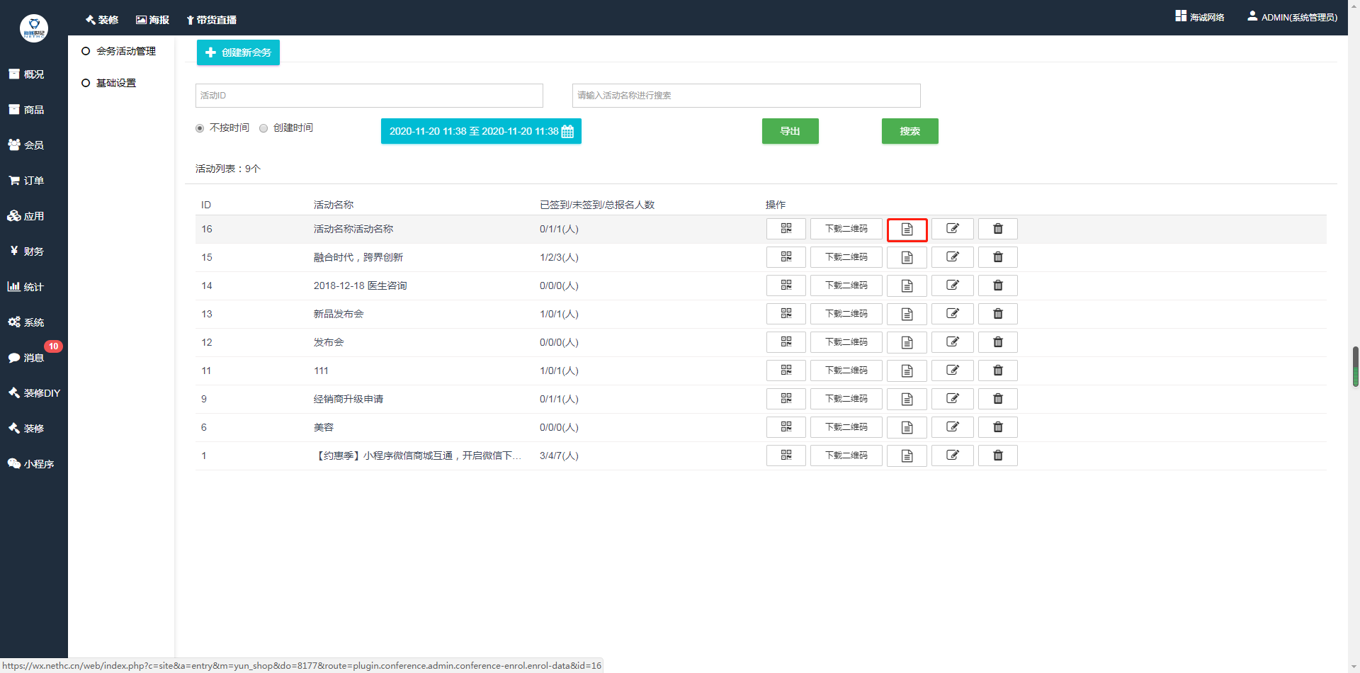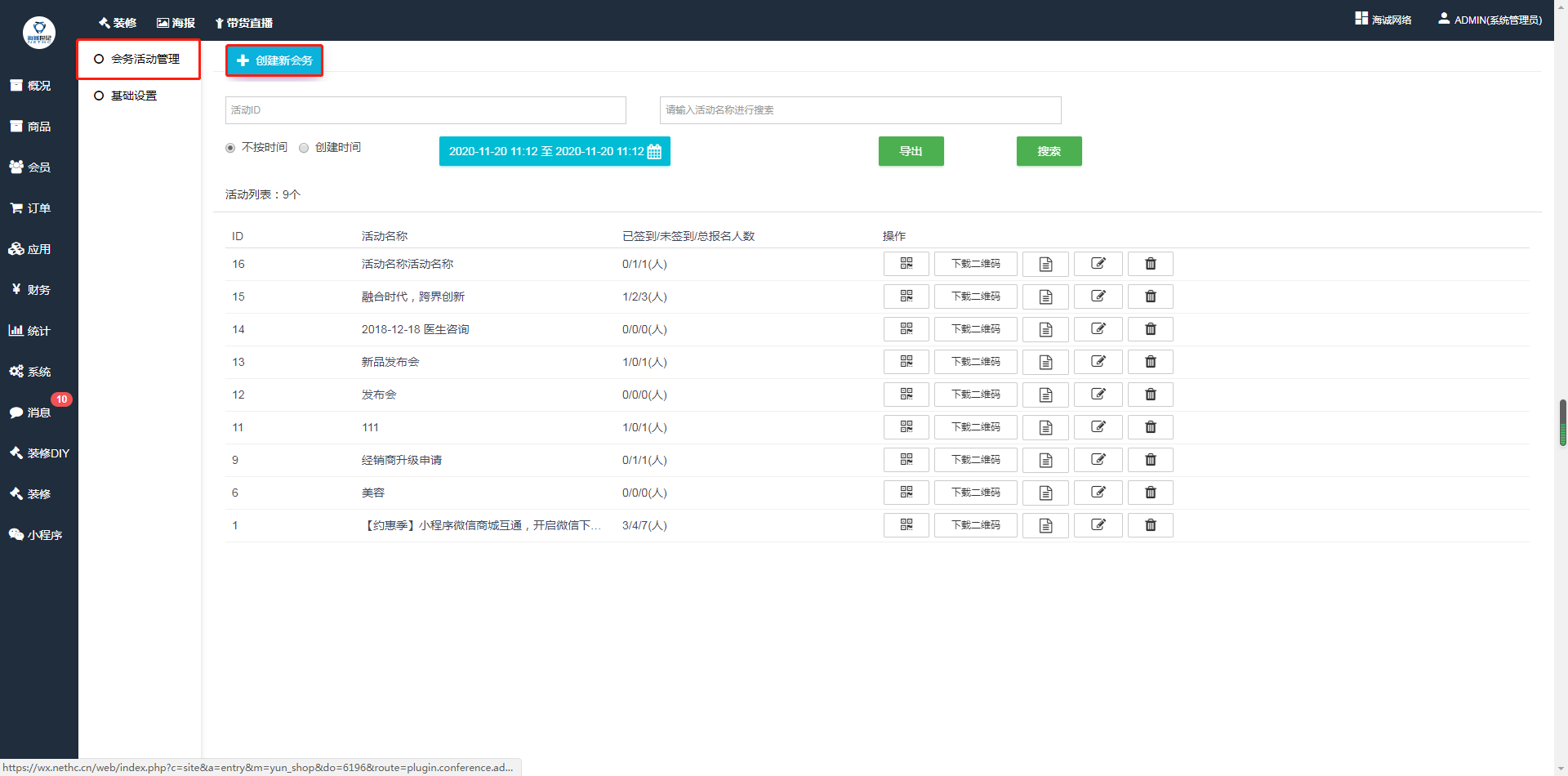 ## 1、后台—应用—会务活动—会务活动管理,点击创建新会务