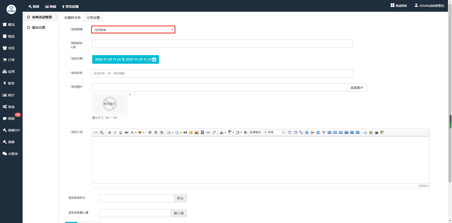 ## (3)表单添加完成之后,回到会务活动管理创建新的会务活动,选择刚添加的自定义表单,填写好活动信息