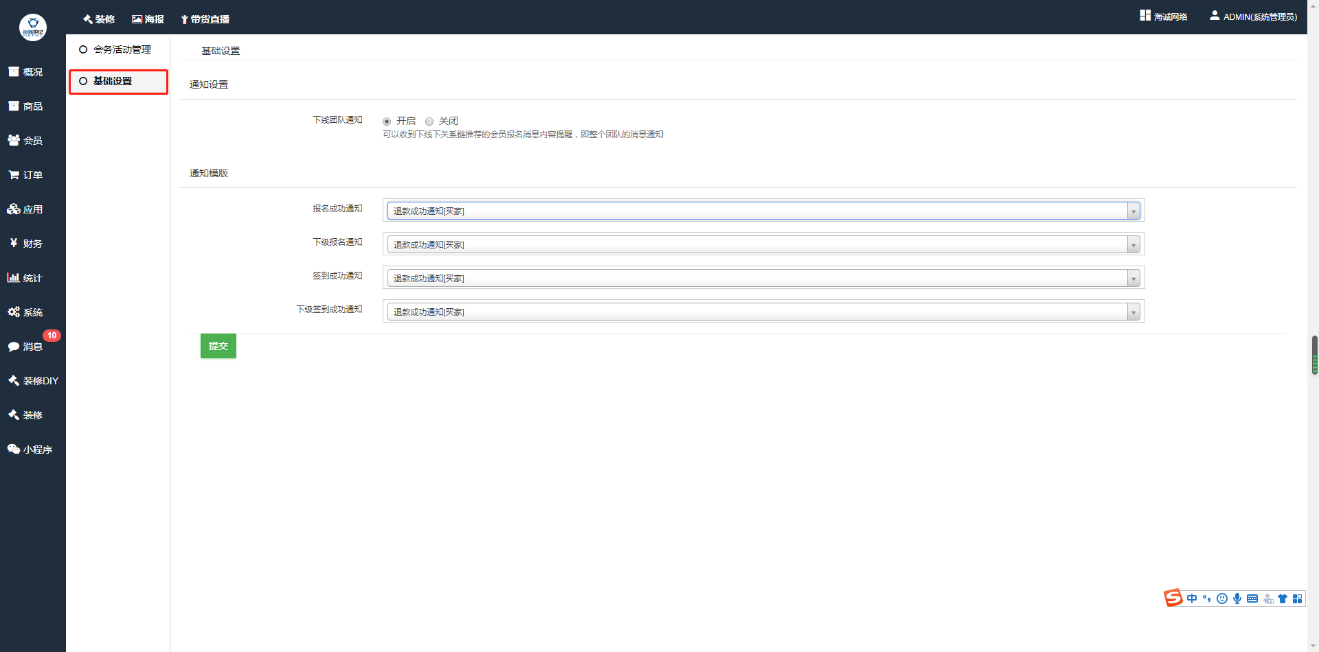 ## 2、会务活动基础设置可以进行下级团队通知消息的设置及通知模板的选择,设置后可以收到下线下关系链推荐的会员报名消息内容提醒,即整个团队的消息通知。**(下线团队通知必须开启)**