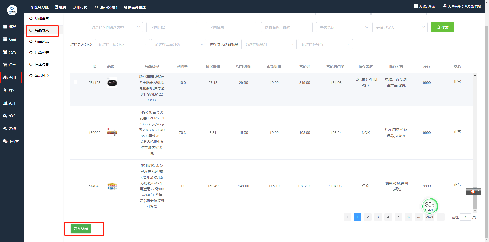 ## 2、**商城后台 应用->聚合供应链链->商品导入**,导入选品库中的产品,导入时需要选择商品分类;导入后可在聚合供应链插件商品管理中查看导入的商品