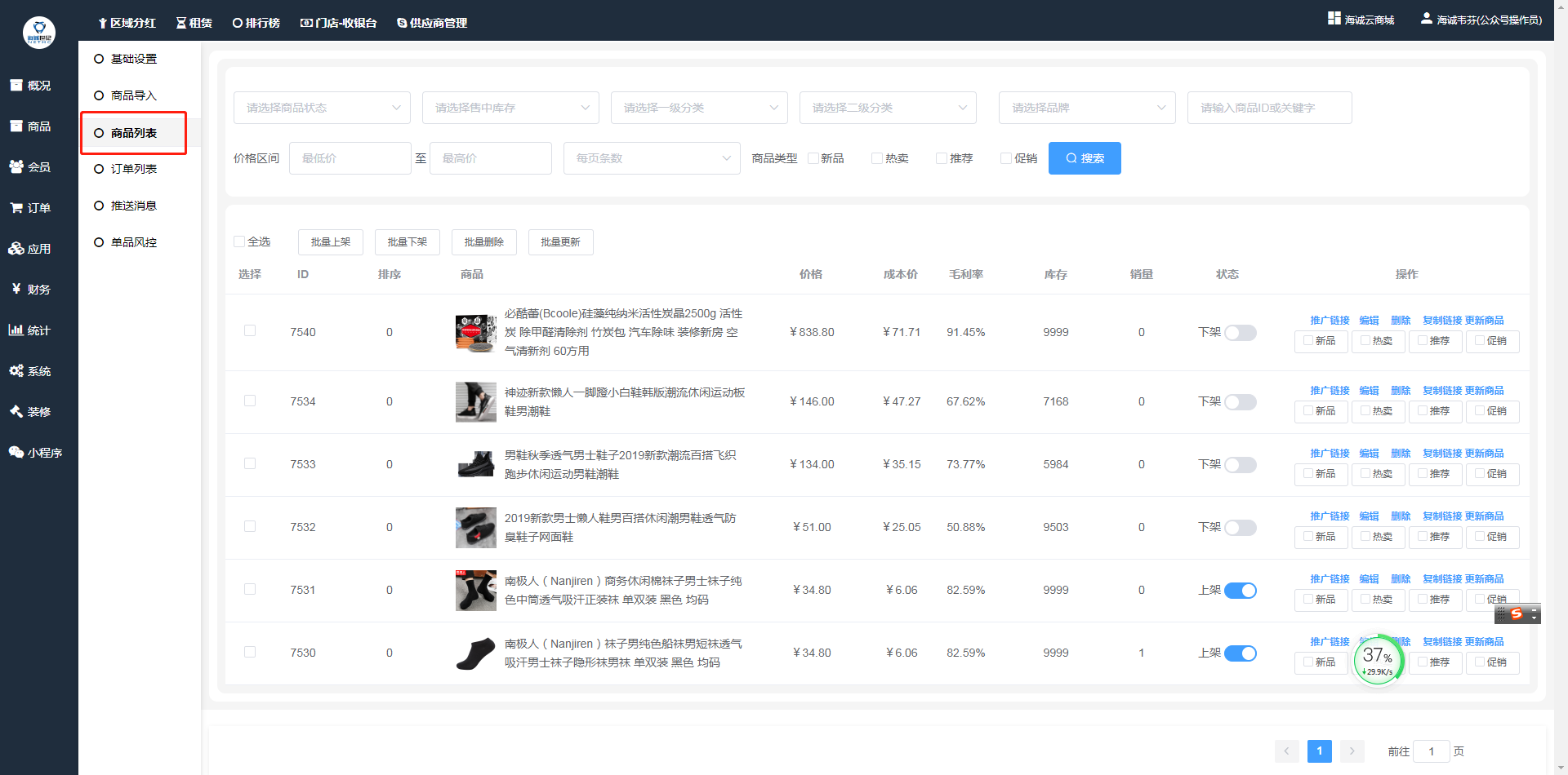 ## 商品列表可以看到从聚合供应链导入的所有商品的价格及状态等信息