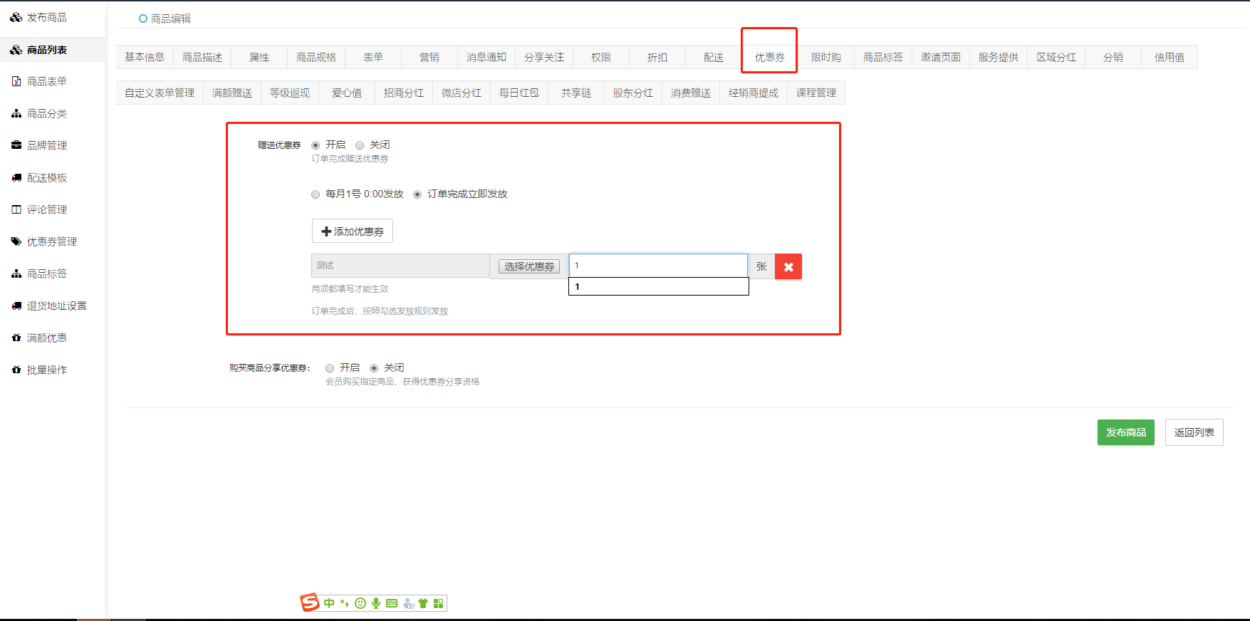 >[danger]### 注意:这里选择优惠卷之前,需要在优惠卷板块先创建优惠卷才行。