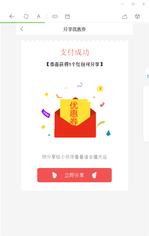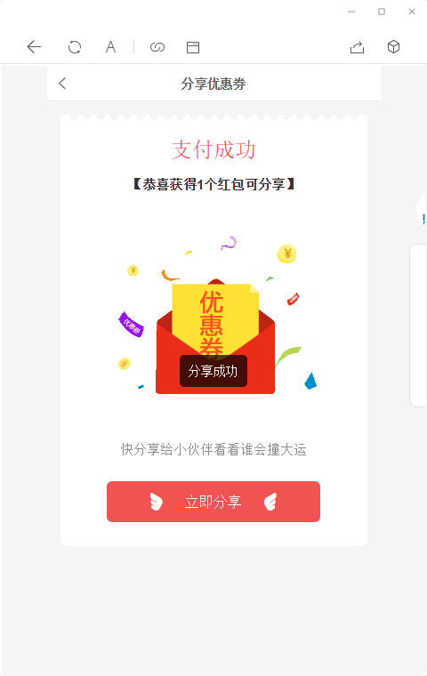 #### **购物后,手机上会自动弹出一个分享的页面。按照求进行分享就可以获得优惠卷。**