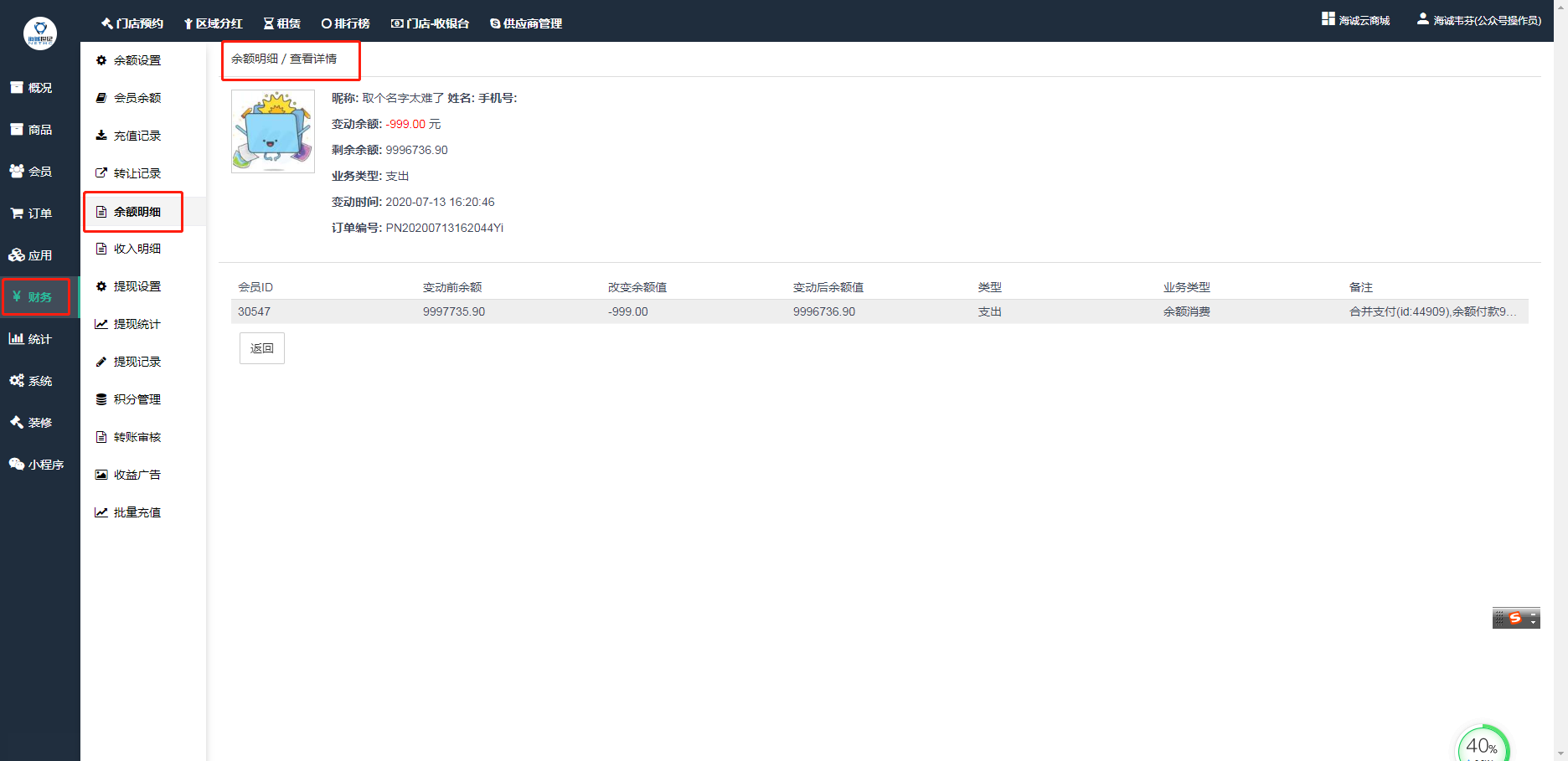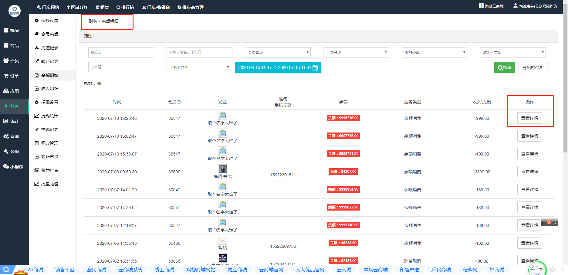 ## **财务—余额明细** 中,可以直接看到所有会员余额的每一笔支出、收入、转让的记录,比如业务类型、收入\\支出、操作等