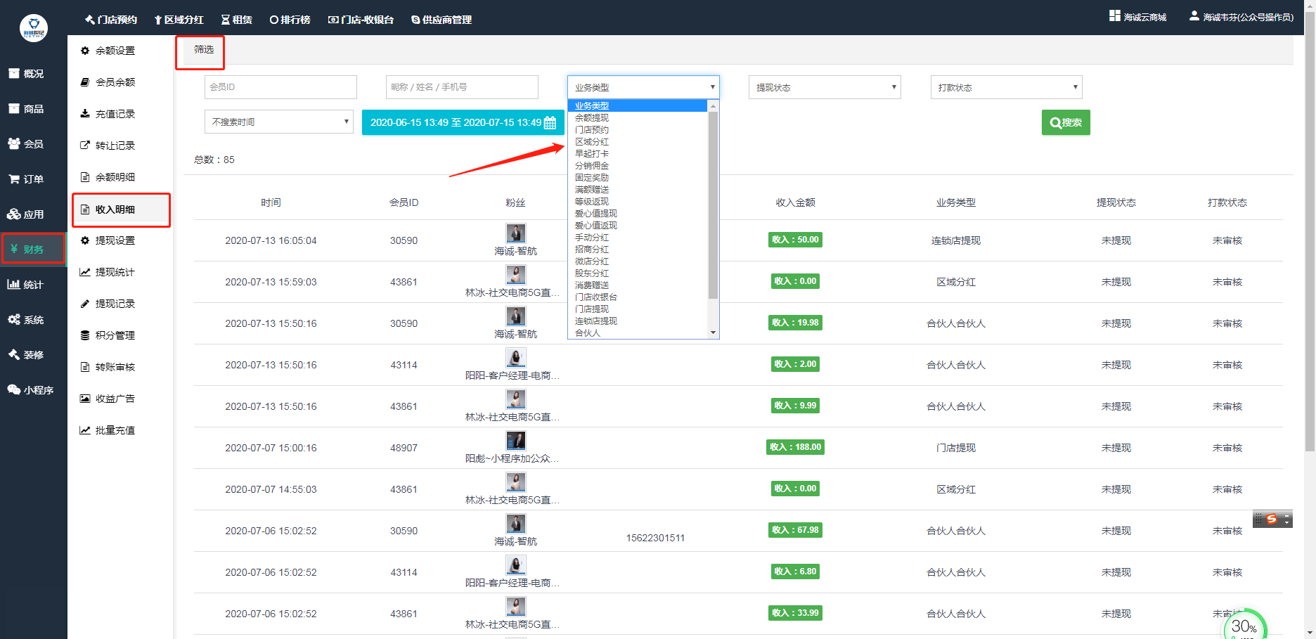 ## 在上方也可以根据**会员ID、昵称、姓名、手机号**,或者**业务类型**、**提现状态**、**打款状态**来进行查找记录