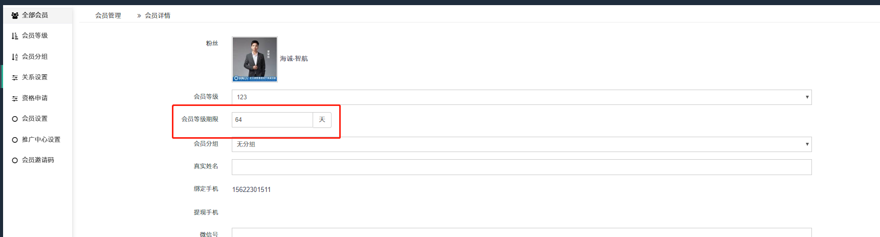 ## 后台也可以查看/编辑某个会员会员等级剩余时间
