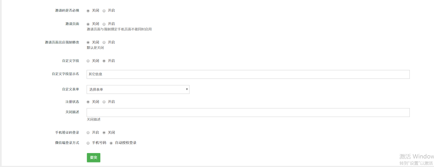 ## 11、邀请码:是否开启邀请码功能,开启后,会员绑定手机时提示可以填写邀请码