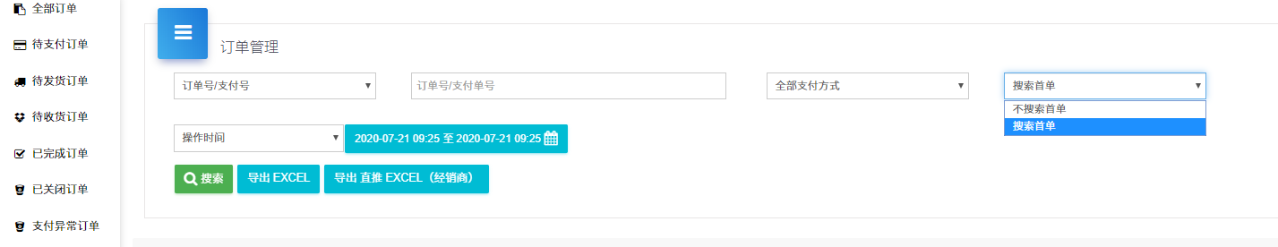 ## 在订单管理中,搜索筛选增加搜索首单,即可筛选出首单商品设置的商品,用户首次支付的订单列表。