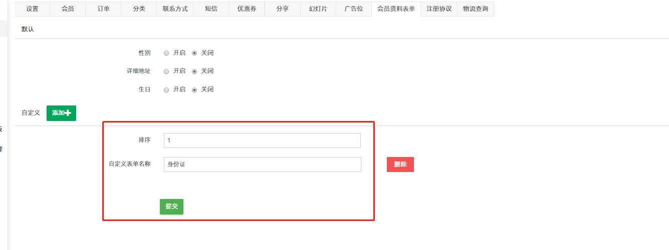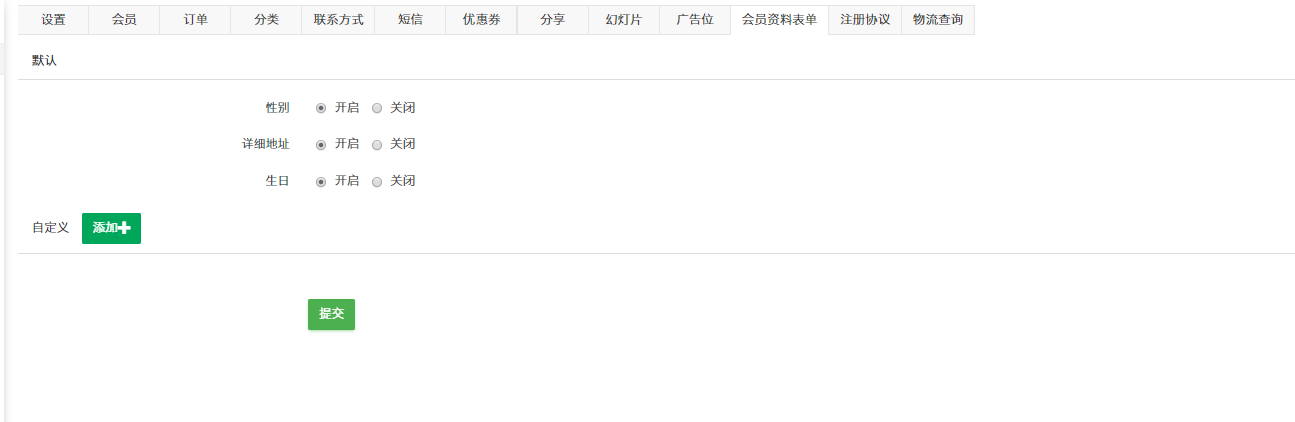 ## 1、默认:前端-会员中心-设置里面是否显示需要填写的表单