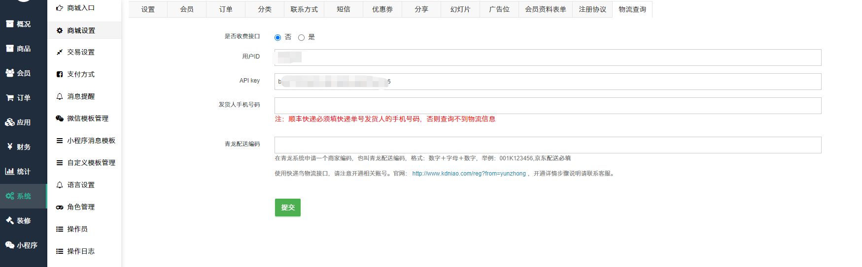 ## 平台对接默认第三方快递鸟账号,快递鸟默认中通、申通和圆通三家物流公司是免费接口,其余均为付费接口,如果需要对接其它物流,需到快递鸟后台购买付费套餐