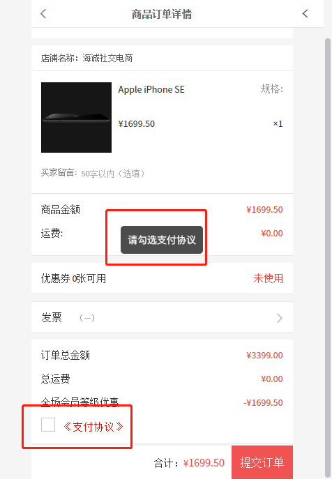 ## 8、支付协议开启:开启后,会员购买商品需要勾选协议,否则不能购买商品