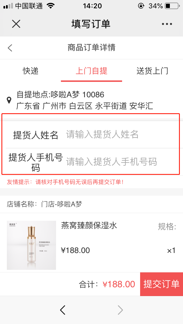 ## 进店选购后选择上门自提需要填写提货人姓名、手机号码