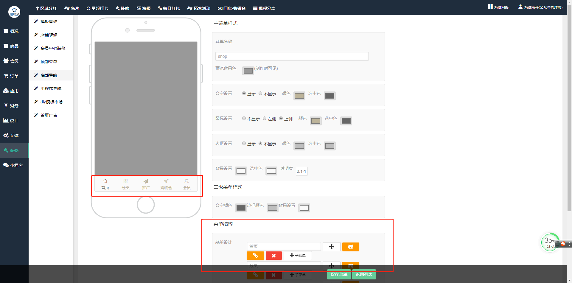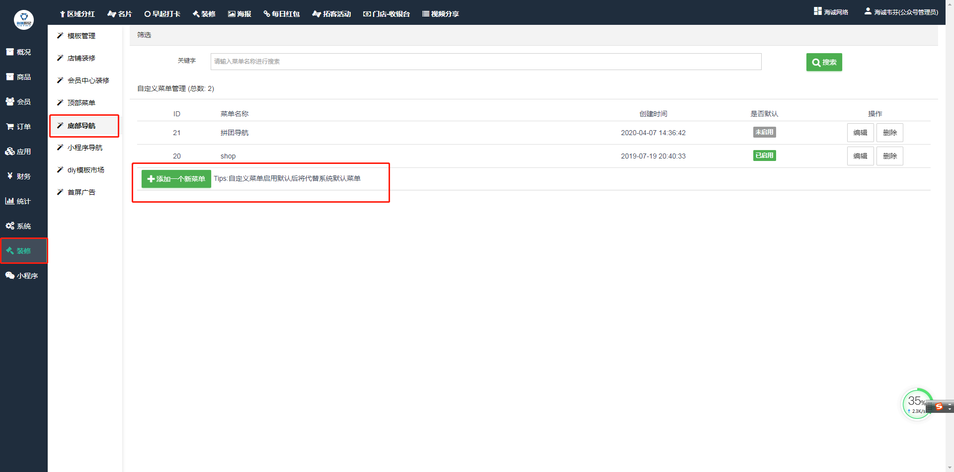 ## 商家可通过商城后台自主编辑一个底部导航菜单添加至商城,菜单的名称、背景颜色、文字颜色等均可自主设置。在**系统--装修--底部导航--添加一个新菜单**,如下图: